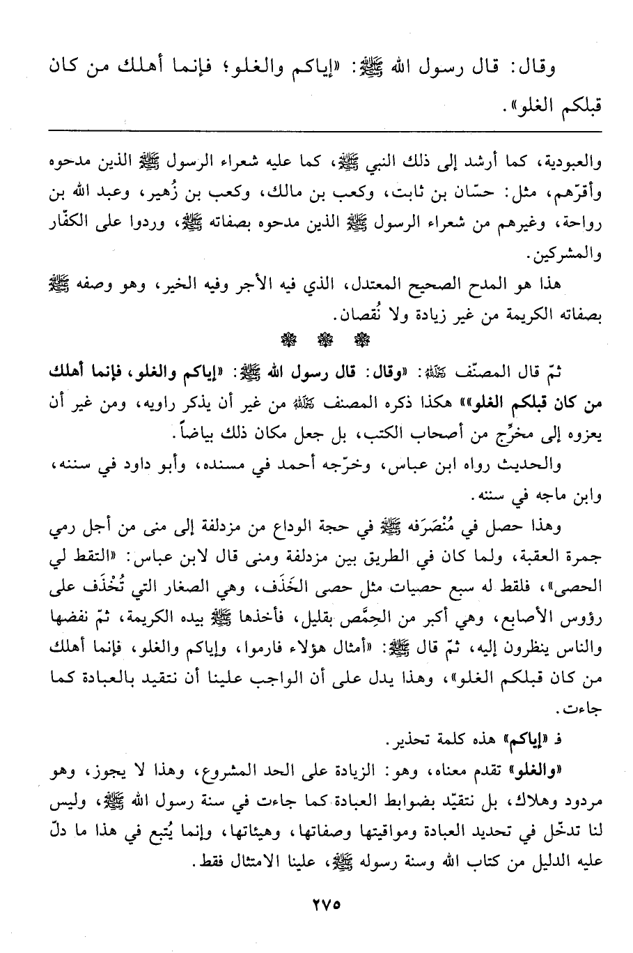 "والغلو" تقدم معناه، وهو: الزيادة على الحد المشروع، وهذا لا يجوز، وهو مردود وهلاك، بل نتقيّد بضوابط العبادة كما جاءت في سنة رسول الله صَلَّى اللَّهُ عَلَيْهِ وَسَلَّمَ، وليس لنا تدخّل في تحديد العبادة ومواقيتها وصفاتها، وهيئاتها، وإنما يتبع في هذا ما دلّ عليه الدليل من كتاس الله وسنة رسوله صَلَّى اللَّهُ عَلَيْهِ وَسَلَّمَ، علينا الامتثال فقط.