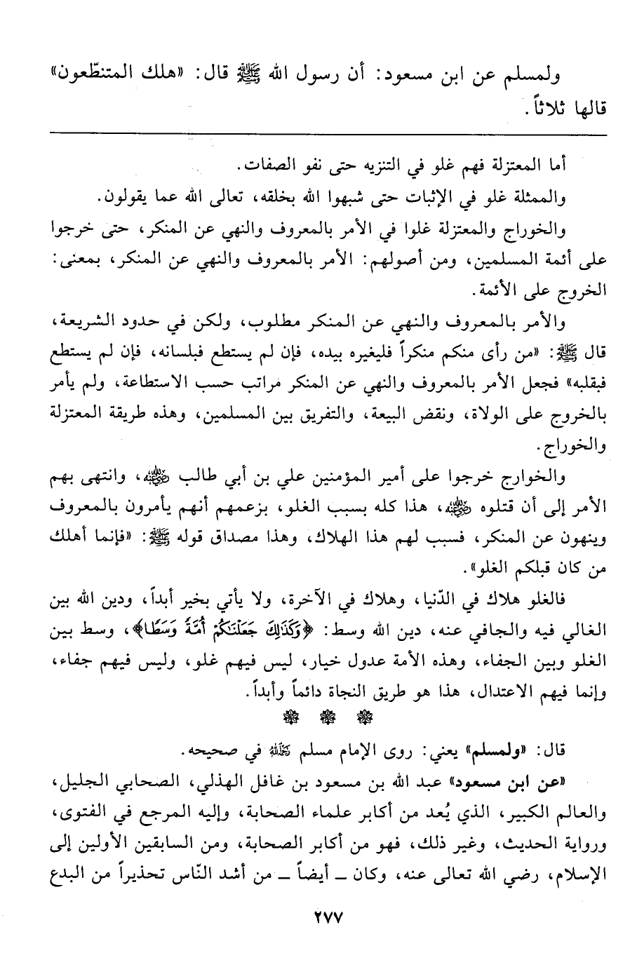 ولمسلم عن ابن مسعود: أن رسول الله صَلَّى اللَّهُ عَلَيْهِ وَسَلَّمَ قال: "هلك المتنطّعون" قالها ثلاثاً.