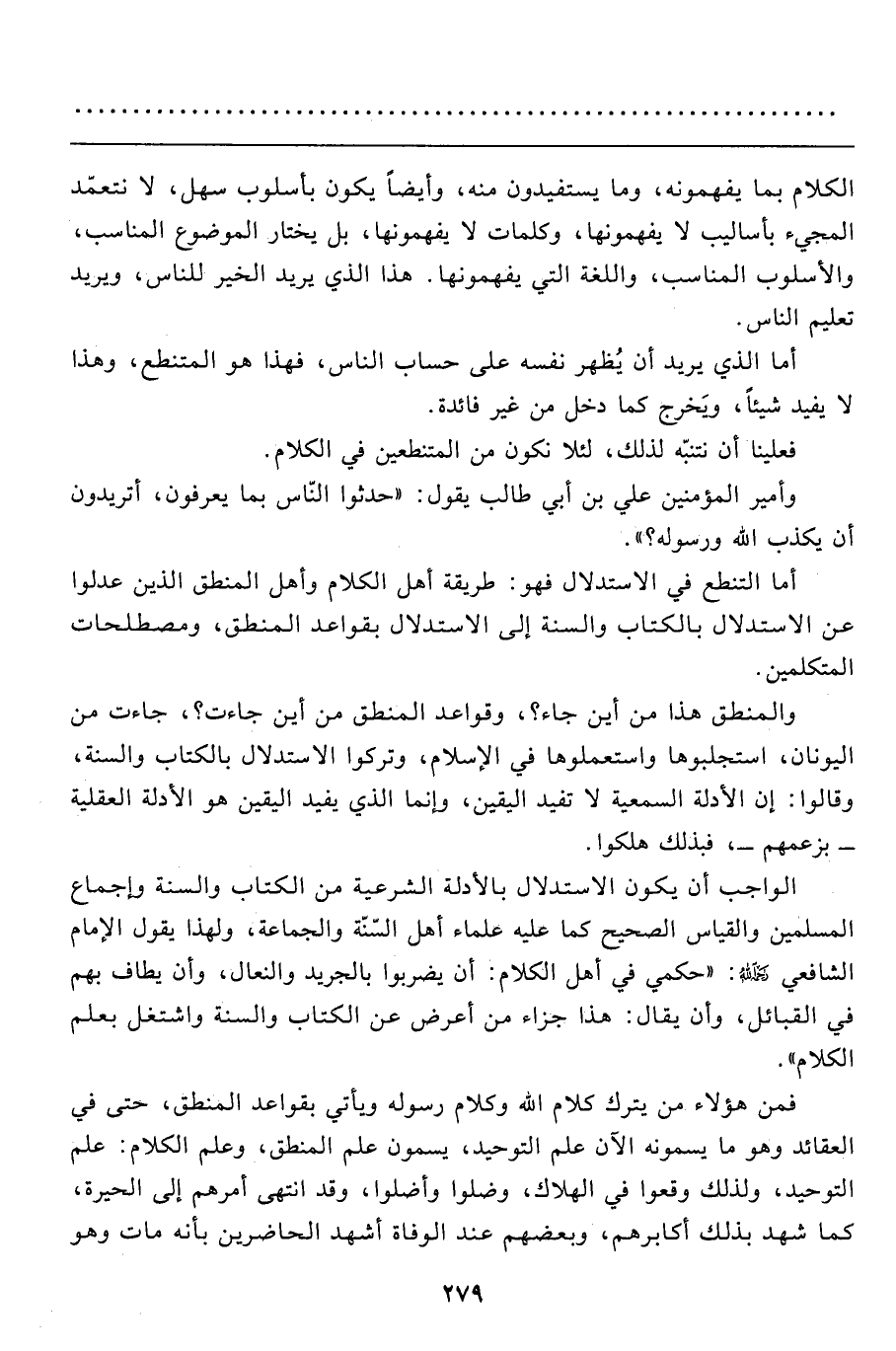 فمن هؤلاء من يترك كلام الله وكلام رسوله ويأتي بقواعد المنطق، حتى في العقائد وهو ما يسمونه الآن علم التّوحيد، يسمون علم المنطق، وعلم الكلام: علم التّوحيد، ولذلك وقعوا في الهلاك، وضلوا وأضلوا، وقد انتهى أمرهم إلى الحيرة، كما شهد بذلك أكابرهم، وبعضهم عند الوفاة أشهد الحاضرين بأنه مات وهو