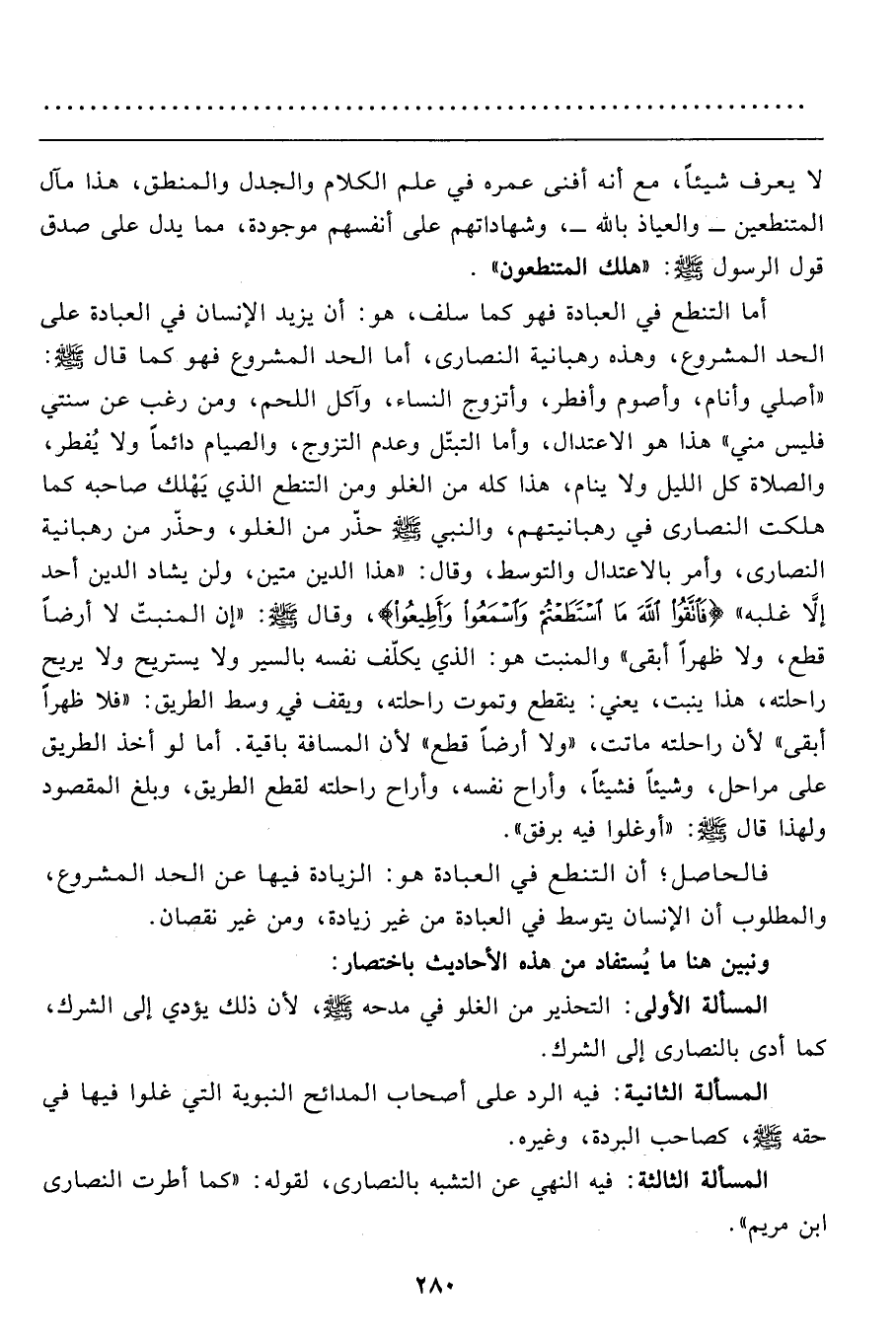 لا يعرف شيئاً، مع أنه أفنى عمره في علم الكلام والجدل والمنطق، هذا مآل المتنطعين- والعياذ بالله-، وشهاداتهم على أنفسهم موجودة، مما يدل على صدق قول الرسول صَلَّى اللَّهُ عَلَيْهِ وَسَلَّمَ: "هلك المتنطعون".