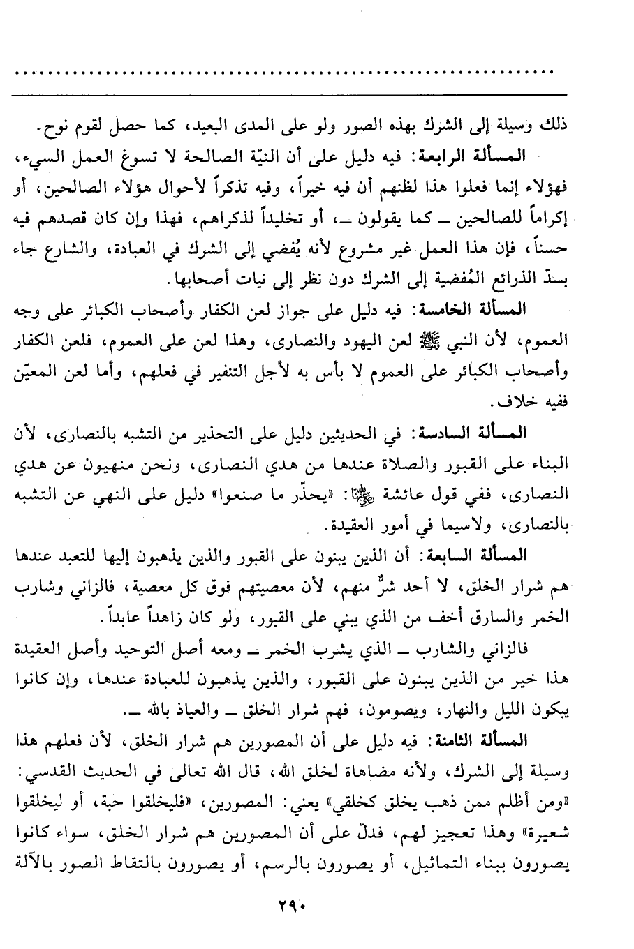 المسألة الرابعة: فيه دليل على أن النيّة الصالحة لا تسوغ العمل السيء، فهؤلاء إنما فعلوا هذا لظنهم أن فيه خيراً، وفيه تذكراً لأحوال هؤلاء الصالحين، أو إكراماً للصالحين- كما يقولون-، أو تخليداً لذكراهم، فهذا وإن كان قصدهم فيه حسناً، فإن هذا العمل غير مشروع لأنه يُفضي إلى الشرك في العبادة، والشارع جاء بسدّ الذرائع المُفضية إلى الشرك دون نظر إلى نيات أصحابها.