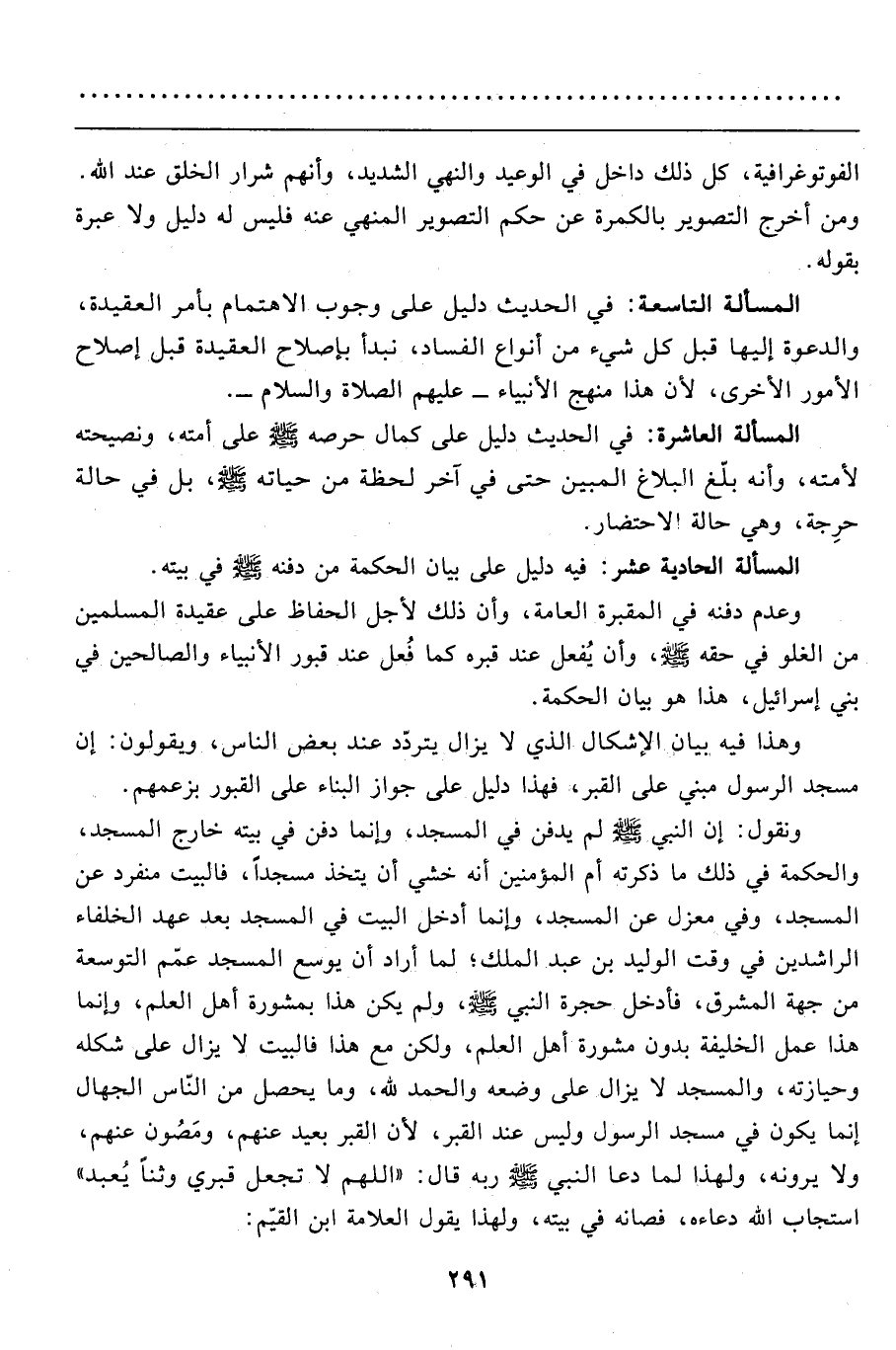 ونقول: إن النبي صَلَّى اللَّهُ عَلَيْهِ وَسَلَّمَ لم يدفن في المسجد، وإنما دفن في بيته خارج المسجد، والحكمة في ذلك ما ذكرته أم المؤمنين أنه خشي أن يتخذ مسجداً، فالبيت منفرد عن المسجد، وفي معزل عن المسجد، وإنما أدخل البيت في المسجد بعد عهد الخلفاء الراشدين في وقت الوليد بن عبد الملك؛ لما أراد أن يوسع المسجد عمّم التوسعة من جهة المشرق، فأدخل حجرة النبي صَلَّى اللَّهُ عَلَيْهِ وَسَلَّمَ، ولم يكن هذا بمشورة أهل العلم، وإنما هذا عمل الخليفة بدون مشورة أهل العلم، ولكن مع هذا فالبيت لا يزال على شكله وحيازته، والمسجد لا يزال على وضعه والحمد لله، وما يحصل من النّاس الجهّال إنما يكون في مسجد الرسول وليس عند القبر، لأن القبر بعيد عنهم، ومَصُون عنهم، ولا يرونه، ولهذا لما دعا النبي صَلَّى اللَّهُ عَلَيْهِ وَسَلَّمَ ربه قال: "اللهم لا تجعل قبري وثناً يُعبد" استجاب الله دعاءه، فصانه في بيته، ولهذا يقول العلامة ابن القيم: