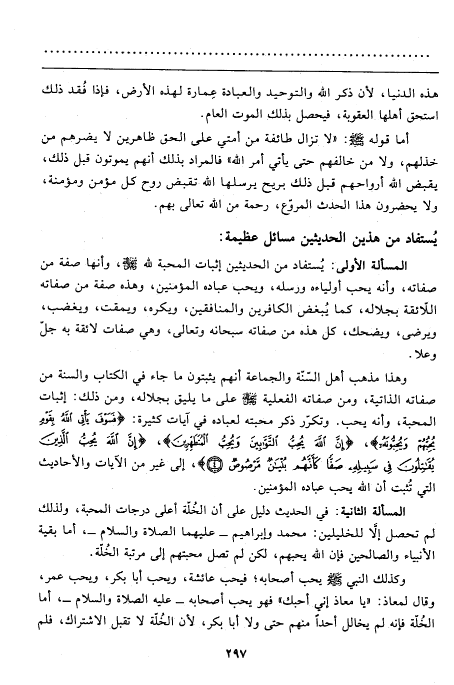 وهذا مذهب أهل السنّة والجماعة أنهم يثبتون ما جاء في الكتاب والسنّة من صفاته الذاتية، ومن صفاته الفعلية سبحانه وتعالى على ما يليق بجلاله، ومن ذلك: أثبات المحبة، وأنه يحب. وتكرّر ذكر محبته لعباده في آيات كثيرة: {فَسَوْفَ يَأْتِي اللهُ بِقَوْمٍ يُحِبُّهُمْ وَيُحِبُّونَهُ} ، {إِنَّ اللهَ يُحِبُّ التَّوَّابِينَ وَيُحِبُّ الْمُتَطَهِّرِينَ} ، {إِنَّ اللهَ يُحِبُّ الَّذِينَ يُقَاتِلُونَ فِي سَبِيلِهِ صَفّاً كَأَنَّهُمْ بُنْيَانٌ مَرْصُوصٌ (4) } ، إلى غير من الآيات والأحاديث التي تثبت أن الله يحب عباده المؤمنين.