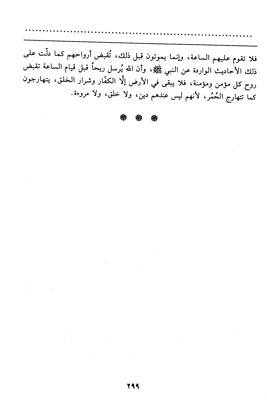 فلا تقوم عليهم الساعة، وإنما يموتون قبل ذلك، تُقبض أرواحهم كما دلّت على ذلك الأحاديث الواردة عن النبي صَلَّى اللَّهُ عَلَيْهِ وَسَلَّمَ، وأن الله يُرسل ريحاً قبل قيام الساعة تقبض روح كل مؤمن ومؤمنة، فلا يبقى في الأرض إلاّ الكفّار وشرار الخلق، يتهارجون كما تتهارج الحُمُر، لأنهم ليس عندهم دين، ولا خلق، ولا مروءة.