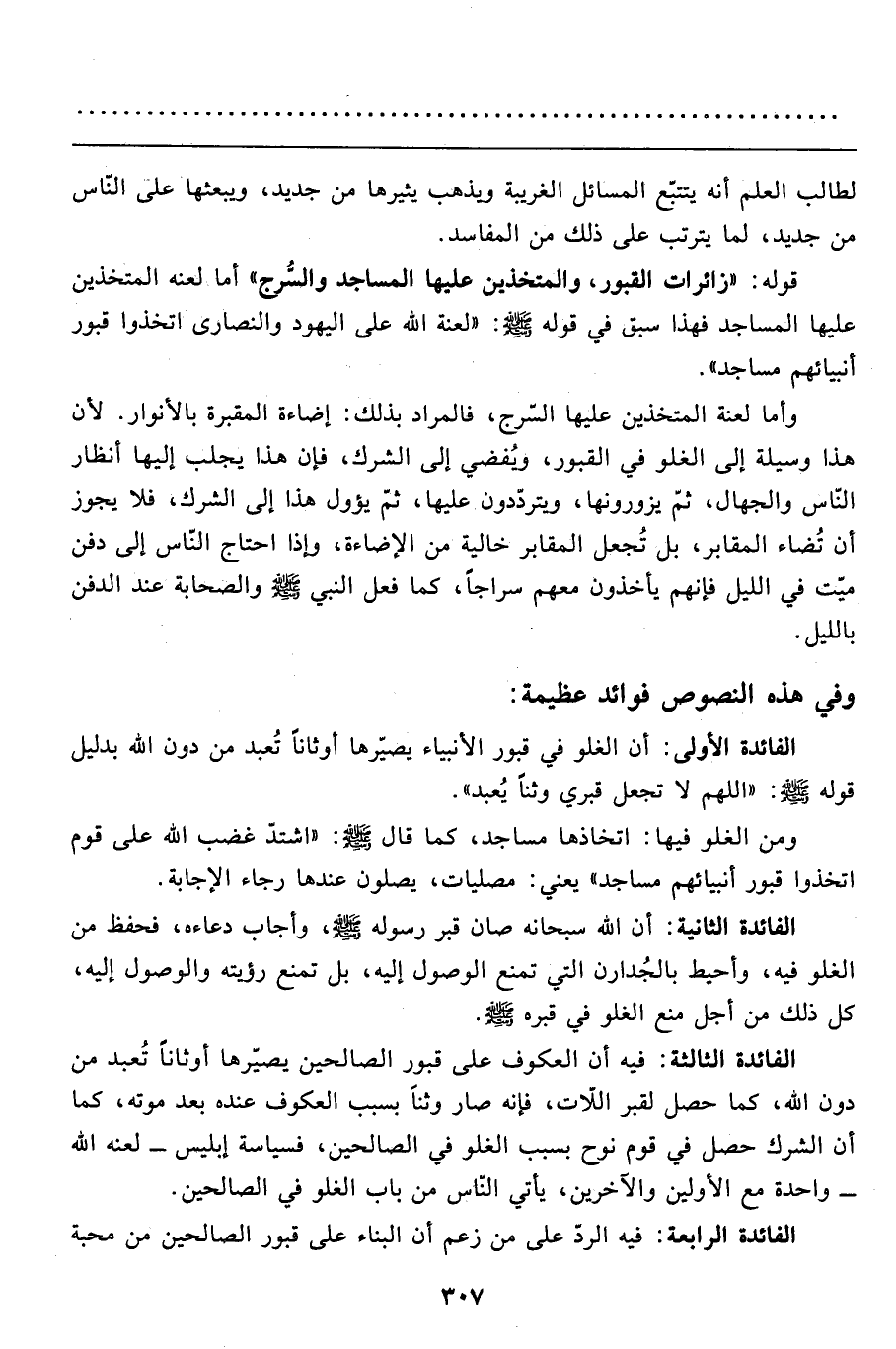الفائدة الأولى: أن الغلو في قبور الأنبياء يصيّرها أوثاناً تُعبد من دون الله بدليل قوله صَلَّى اللَّهُ عَلَيْهِ وَسَلَّمَ: "اللهم لا تجعل قبري وثناً يُعبد".