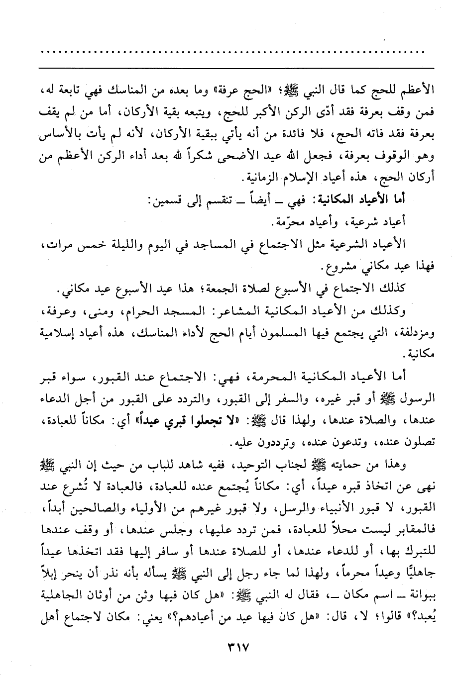 أما الأعياد المكانية المحرمة، فهي: الاجتماع عند القبور، سواء قبر الرسول صَلَّى اللَّهُ عَلَيْهِ وَسَلَّمَ أو قبر غيره، والسفر إلى القبور، والتردد على القبور من أجل الدعاء عندها، والصلاة عندها، ولهذا قال صَلَّى اللَّهُ عَلَيْهِ وَسَلَّمَ: "لا تجعلوا قبري عيداً" أي: مكاناً للعبادة، تصلون عنده، وتدعون عنده، وترددون عليه. وهذا من حمايته صَلَّى اللَّهُ عَلَيْهِ وَسَلَّمَ لجناب التّوحيد، ففيه شاهد للباب من حيث إن النبي صَلَّى اللَّهُ عَلَيْهِ وَسَلَّمَ نهى عن اتخاذ قبره عيداً، أي: مكاناً يُجتمع عنده للعبادة، فالعبادة لا تُشرع عند القبور، لا قبور الأنبياء والرسل، ولا قبور غيرهم من الأولياء والصالحين أبداً، فالمقابر ليست محلاً للعبادة، فمن تردد عليها، وجلس عندها، أو وقف عندها للتبرك بها، أو للدعاء عندها، أو للصلاة عندها أو سافر إليها فقد اتخذها عيداً جاهليًّا وعيداً محرماً، ولهذا لما جاء رجل إلى النبي صَلَّى اللَّهُ عَلَيْهِ وَسَلَّمَ يسأله بأنه نذر أن ينحر إبلاً ببوانة- اسم مكان-، فقال له النبي صلى الله عليه وسل: "هل كان فيها وثن من أوثان الجاهلية يُعبد؟ " قالوا: لا، قال: "هل كان فيها عيد من أعيادهم؟ " يعني: مكان لاجتماع أهل