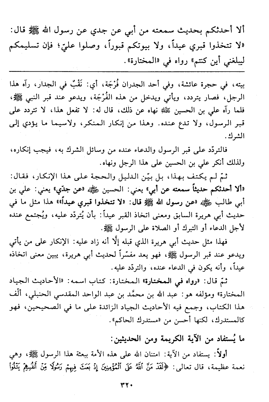ثمّ لم يكتف بهذا، بل بين الدليل والحجة على هذا الإنكار، فقال: "ألا أحدثكم حديثاً سمعته عن أبي" يعني: الحسين رضي الله عنه "عن جدَّي" يعني: علي بن أبي طالب رضي الله عنه عن رسول الله صَلَّى اللَّهُ عَلَيْهِ وَسَلَّمَ قال: "لا تتخذوا قبري عيداً" هذا مثل ما في حديث أبي هريرة السابق ومعنى اتخاذ القبر عيداً: بأن يُتردّد عليه، ويجتمع عنده لأجل الدعاء أو التبرك أو الصلاة على الرسول صَلَّى اللَّهُ عَلَيْهِ وَسَلَّمَ.