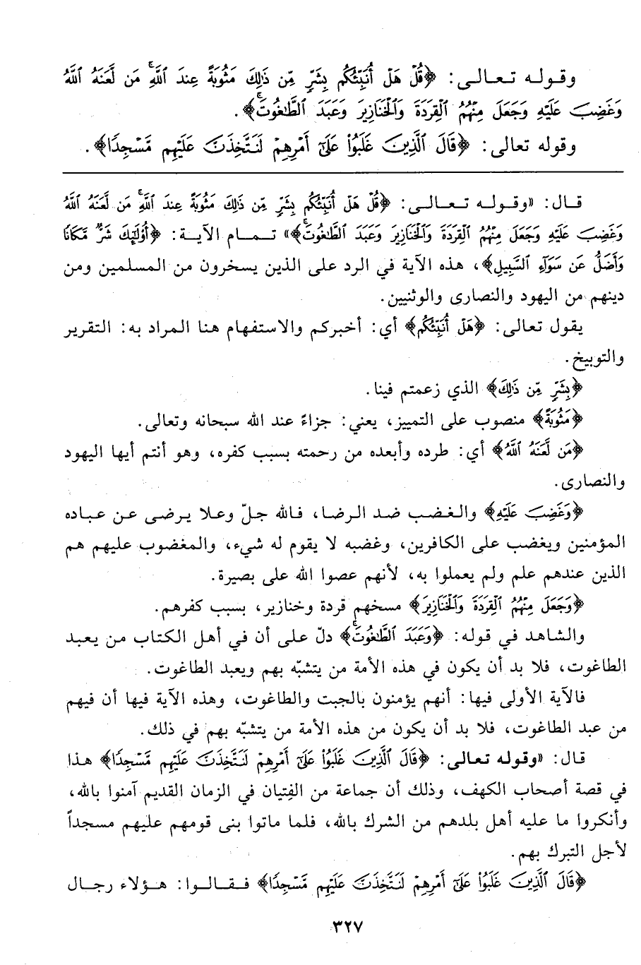 قال: "وقوله تعالى: {قُلْ هَلْ أُنَبِّئُكُمْ بِشَرٍّ مِنْ ذَلِكَ مَثُوبَةً عِنْدَ اللهِ مَنْ لَعَنَهُ اللهُ وَغَضِبَ عَلَيْهِ وَجَعَلَ مِنْهُمُ الْقِرَدَةَ وَالْخَنَازِيرَ وَعَبَدَ الطَّاغُوتَ} تمام الآية: {أُولَئِكَ شَرٌّ مَكَاناً وَأَضَلُّ عَنْ سَوَاءِ السَّبِيلِ} ، هذه الآية في الرد على الذين يسخرون من المسلمين ومن دينهم من اليهود والنصارى والوثنيين.