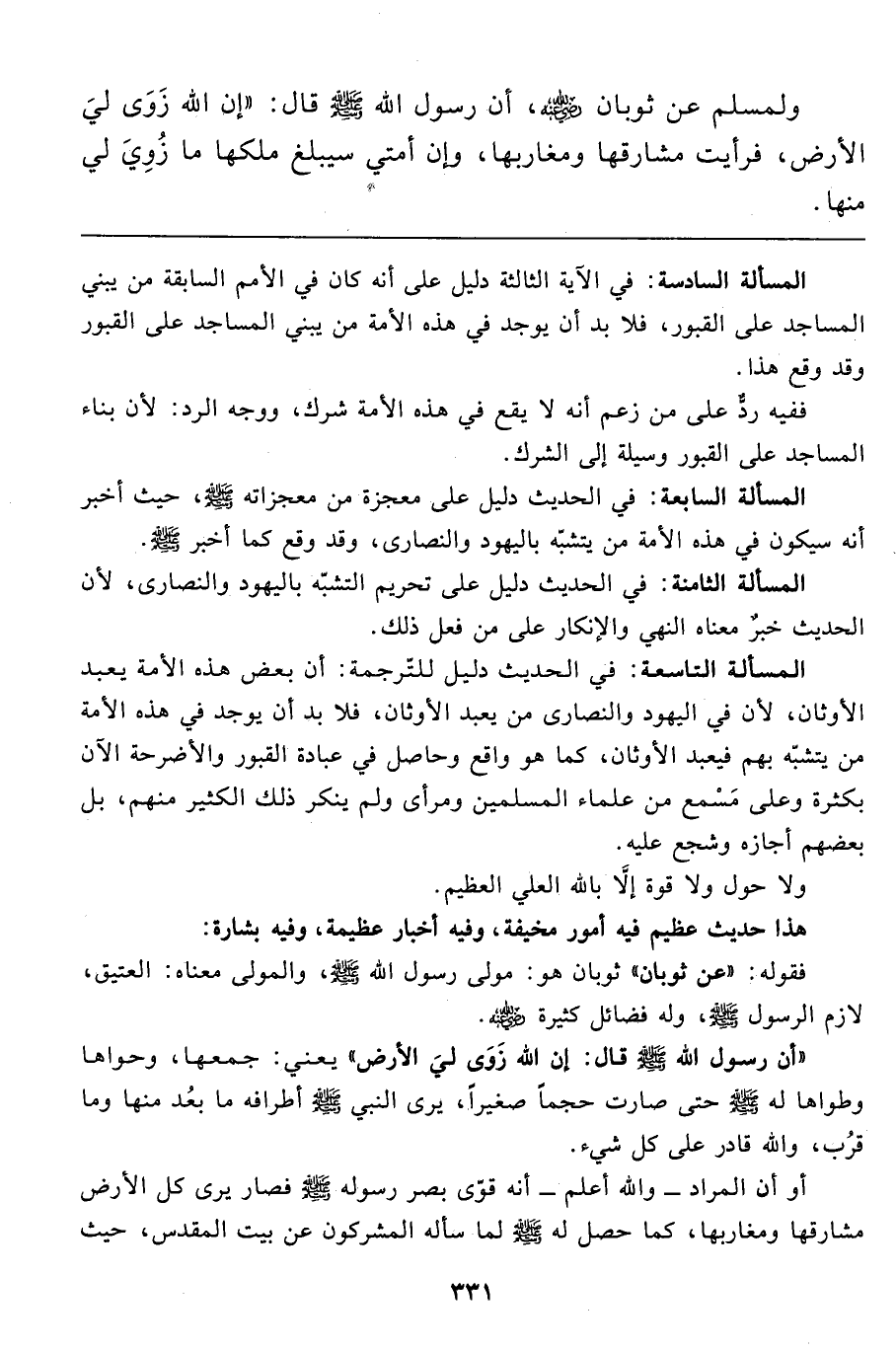 ولمسلم عن ثوبان رضي الله عنه، أن رسول الله صَلَّى اللَّهُ عَلَيْهِ وَسَلَّمَ قال: "إن الله زَوَى ليَ الأرض، فرأيت مشارقها ومغاربها، وإن أمتي سيبلغ ملكها ما زُوِيَ لي منها.