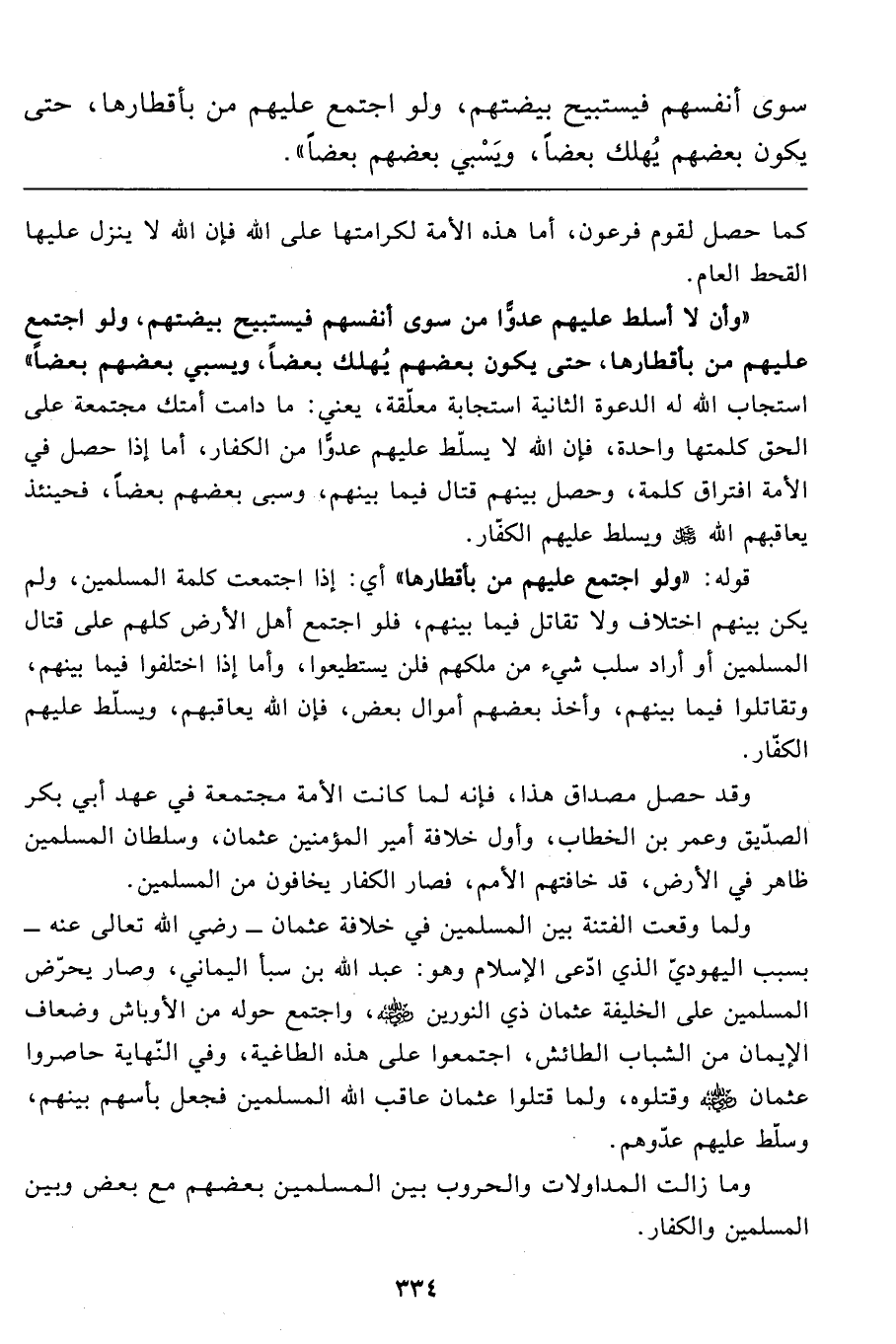 "وأن لا أسلط عليهم عدوًّا من سوى أنفسهم فيستبيح بيضتهم، ولو اجتمع عليهم من بأقطارها، حتى يكون بعضهم يُهلك بعضاً، ويسبي بعضهم بعضاً" استجاب الله له الدعوة الثانية استجابة معلّقة، يعني: ما دامت أمتك مجتمعة على الحق كلمتها واحدة، فإن الله لا يسلّط عليهم عدوًّا من الكفار، أما إذا حصل في الأمة افتراق كلمة، وحصل بينهم قتال فيما بينهم، وسبى بعضهم بعضاً، فحينئذ يعاقبهم الله عزّ وجلّ ويسلط عليهم الكفّار.