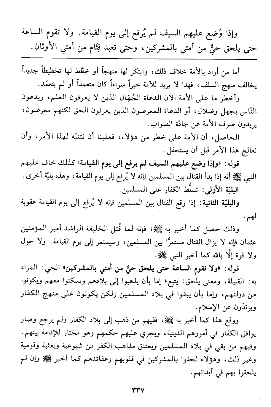 وإذا وُضع عليهم السيف لم يُرفع إلى يوم القيامة. ولا تقوم الساعة حتى يلحق حيٌّ من أمتي بالمشركين، وحتى تعبد فِئَام من أمتي الأوثان.