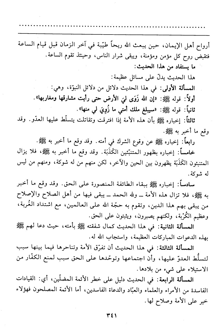 المسألة الرابعة: في الحديث دليل على خطر الأئمة المضلّين، أي: القيادات الفاسدة من الأمراء والعلماء والعبّاد والدعاة الفاسدين، أما الأئمة المصلحون فهؤلاء خير على الأمة وصلاح لها.