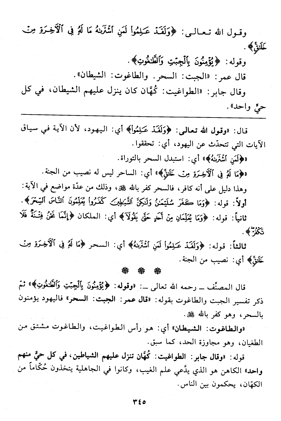 قال المصنِّف- رحمه الله تعالى-: " وقوله {يُؤْمِنُونَ بِالْجِبْتِ وَالطَّاغُوتِ} " ثمّ ذكر تفسير الجبت والطاغوت بقوله: "قال عمر: الجبت: السحر" فاليهود يؤمنون بالسحر، وهو كفر بالله عزّ وجلّ.