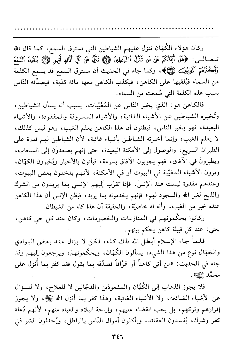 فلما جاء الإسلام أبطل الله ذلك كله، لكن لا يزال عند بعض البوادي والجهّال نوع من هذا الشيء، يسألون الكُهّان، ويحكّمونهم، ويرجعون إليهم وقد جاء في الحديث: "من أتى كاهناً أو عَرَّافاً فصدّقه بما يقول فقد كفر بما أُنزل على محمَّد صَلَّى اللَّهُ عَلَيْهِ وَسَلَّمَ"