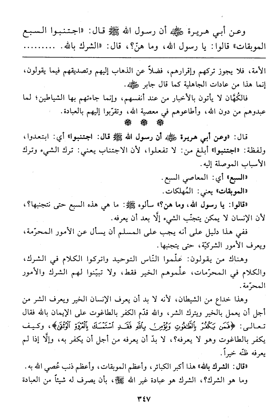 وعن أبي هريرة رضي الله عنه أن رسول الله صَلَّى اللَّهُ عَلَيْهِ وَسَلَّمَ قال: "اجتنبوا السبع الموبقات" قالوا: يا رسول الله، وما هنّ؟، قال: "الشرك بالله..........