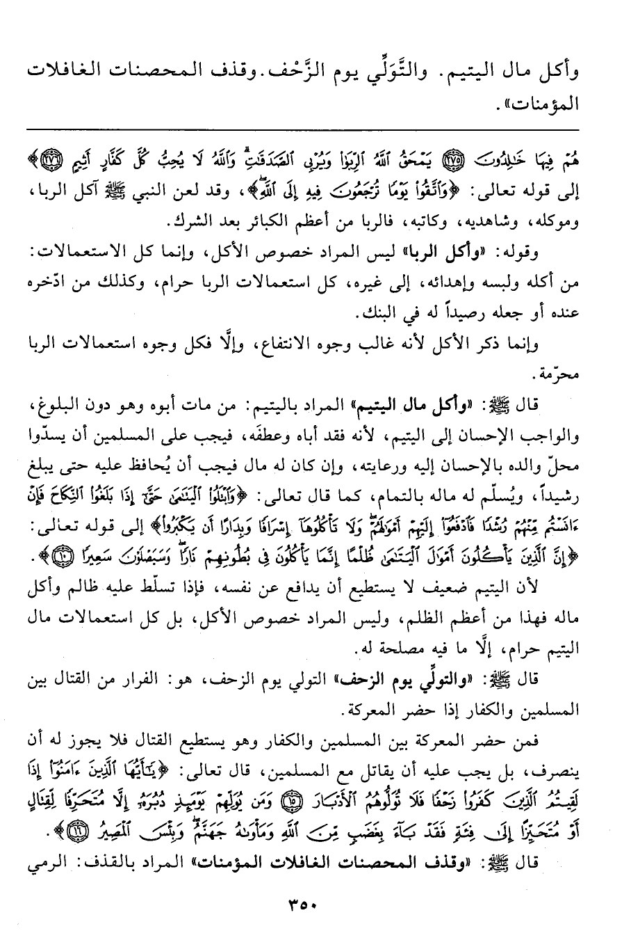 وأكل مال اليتيم. والتَّوَلِّي يوم الزَّحْف. وقذف المحصنات الغافلات المؤمنات".