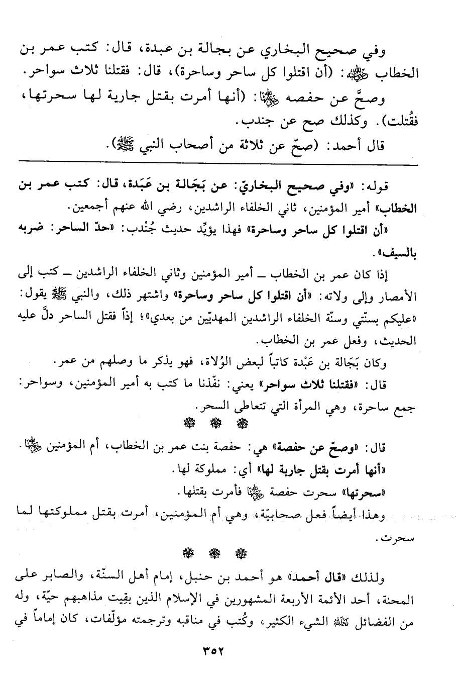 إذا كان عمر بن الخطاب- أمير المؤمنين وثاني الخلفاء الراشدين- كتب إلى الأمصار وإلى ولاته: "أن اقتلوا كل ساحر وساحرة" واشتهر ذلك، والنبي صَلَّى اللَّهُ عَلَيْهِ وَسَلَّمَ يقول: "عليكم بسنتي وسنة الخلفاء الراشدين المهدييّن من بعدي"؛ إذاً فقتل الساحر دلّ عليه الحديث، وفعل عمر بن الخطاب.