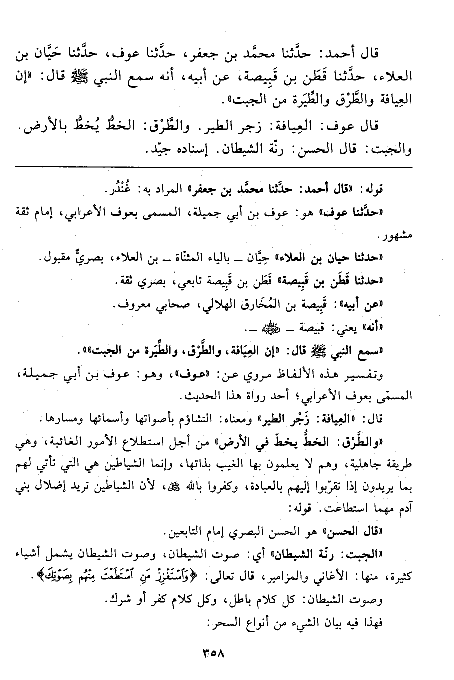 قال أحمد: حدّثنا محمَّد بن جعفر، حدّثنا عوف، وحدّثنا حَيَّان بن العلاء، حدّثنا قَطَن بن قَبِيصة، عن أبيه، أنه سمع النبي صَلَّى اللَّهُ عَلَيْهِ وَسَلَّمَ قال: "إن العِيافة والطَّرْق والطِّيَرة من الجبت".
