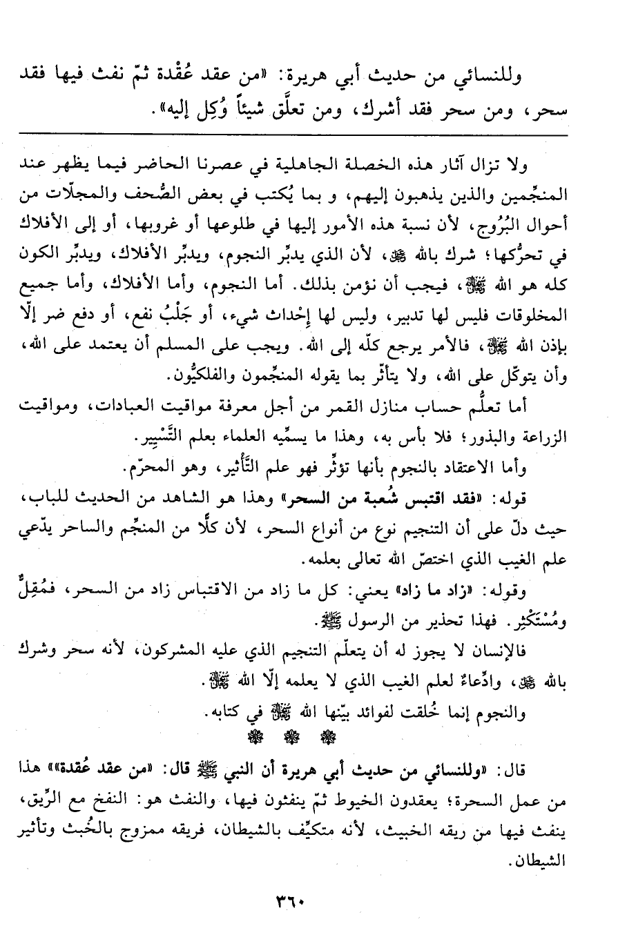 وللنسائي من حديث أبي هريرة: "من عقد عُقْدة ثمّ نفث فيها فقد سحر، ومن سحر فقد أشرك، ومن تعلَّق شيئاً وُكِل إليه".