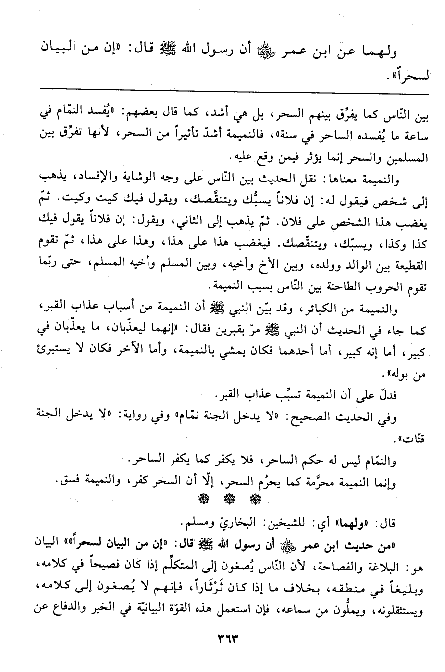 ولهما عن ابن عمر رضي الله عنهما رسول الله صَلَّى اللَّهُ عَلَيْهِ وَسَلَّمَ قال: " إن من البين لسحراً".