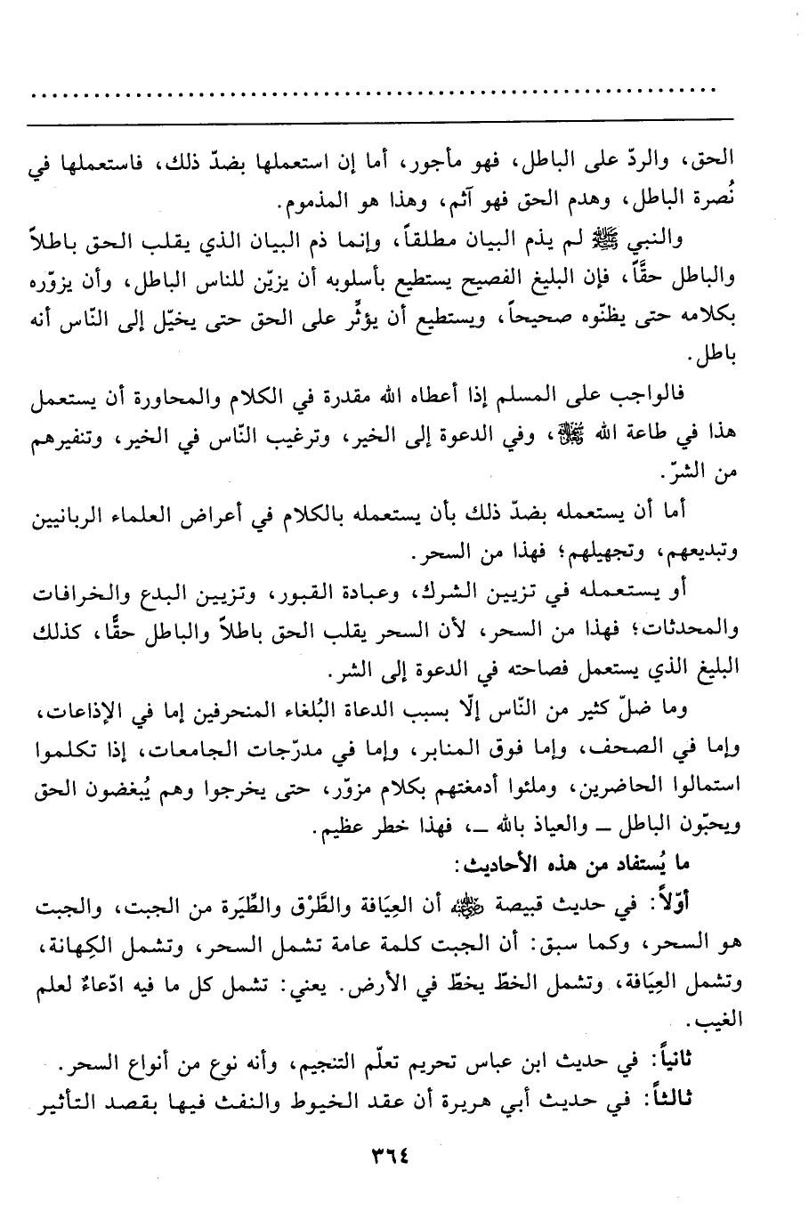 أو يستعمله في تزيين الشرك، وعبادة القبور، وتزيين البدع والخرافات والمحدثات؛ فهذا من السحر، لأن السحر يقلب الحق باطلاً والباطل حقًّا، كذلك البليغ الذي يستعمل فصاحته في الدعوة إلى الشر.