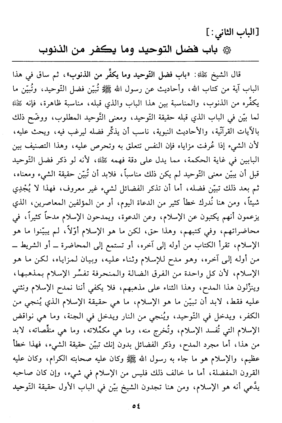 قال الشيخ رحمه الله: "باب فضل التّوحيد وما يكفِّر من الذنوب"، ثم ساق في هذا الباب آية من كتاب الله، وأحاديث عن رسول الله صَلَّى اللَّهُ عَلَيْهِ وَسَلَّمَ تُبيّن فضل التّوحيد، وتُبيّن ما يكفِّره من الذنوب، والمناسبة بين هذا الباب والذي قبله، مناسبة ظاهرة، فإنه رحمه الله لما بيّن في الباب الذي قبله حقيقة التّوحيد، ومعنى التّوحيد المطلوب، ووضّح ذلك بالآيات القرآنية، والأحاديث النبوية، ناسب أن يذكِّر فضله ليرغب فيه، ويحث عليه، لأن الشيء إذا عُرفت مزاياه فإن النفس تتعلق به وتحرص عليه، وهذا التصنيف بين البابين في غاية الحكمة، مما يدل على دقة فهمه رحمه الله، لأنه لو ذكر فضل التّوحيد قبل أن يبيّن معنى التّوحيد لم يكن ذلك مناسباً، فلابد أن تُبيّن حقيقة الشيء ومعناه، ثم بعد ذلك تبين فضله، أما أن تذكر الفضائل لشيء غير معروف، فهذا لا يُجْدِي شيئاً، ومن هنا نُدرك خطأ كثير من الدعاة اليوم، أو من المؤلفين المعاصرين، الذي يزعمون أنهم يكتبون عن الإسلام، وعن الدعوة، ويمدحون الإسلام مدحاً كثيراً، في محاضراتهم، وفي كتبهم، وهذا حق، لكن ما هو الإسلام أوّلاً، لم يبيّنوا ما هو الإسلام، تقرأ الكتاب من أوله إلى آخره، أو تستمع إلى المحاضرة- أو الشريط- من أوله إلى آخره، وهو مدح للإسلام وثناء عليه، وبيان لمزاياه، لكن ما هو الإسلام، لأن كل واحدة من الفرق الضالة والمنحرفة تفسِّر الإسلام بمذهبها، وينزِّلون هذا المدح، وهذا الثناء على مذهبهم، فلا يكفي أننا نمدح الإسلام ونثني عليه فقط، لابد أن تبيّن ما هو الإسلام، ما هي حقيقة الإسلام الذي يُنجي من الكفر، ويدخل في التّوحيد، ويُنجي من النار ويدخل في الجنة، وما هي نواقض الإسلام التي تُفسد الإسلام، وتُخرج منه، وما هي مكمِّلاته، وما هي منقِّصاته، لابد من هذا، أما مجرد المدح، وذكر الفضائل بدون إنك تبيّن حقيقة الشيء، فهذا خطأ عظيم، والإسلام هو ما جاء به رسول الله صَلَّى اللَّهُ عَلَيْهِ وَسَلَّمَ وكان عليه صحابته الكرام، وكان عليه القرون المفضلة، أما ما خالف ذلك فليس من الإسلام في شيء، وإن كان صاحبه يدَّعي أنه هو الإسلام، ومن هنا تجدون الشيخ بيّن في الباب الأول حقيقة التّوحيد