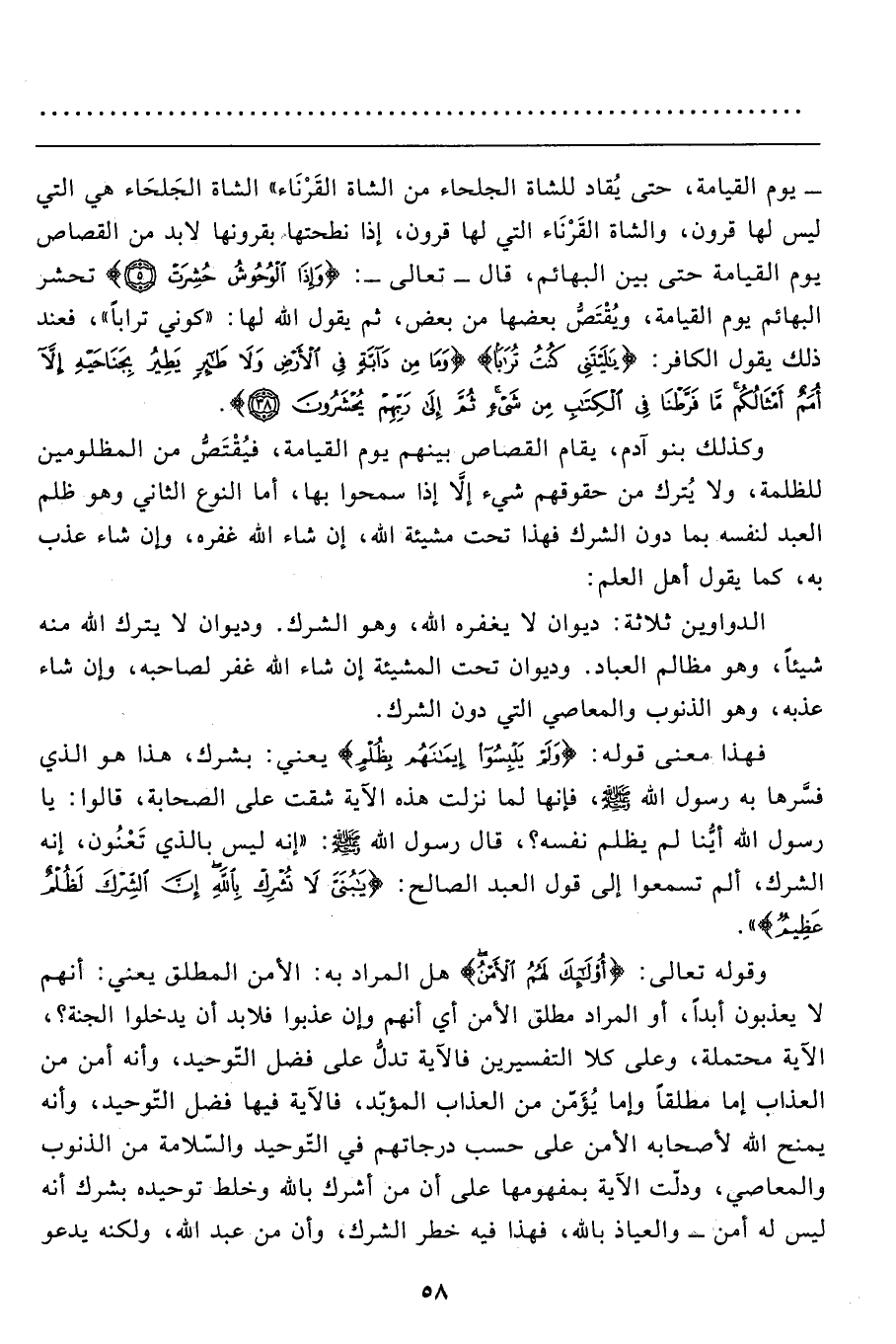 يوم القيامة، حتى يُقاد للشاة الجلحاء من الشاة القَرْنَاء" الشاة الجَلحَاء هي التي ليس لها قرون، والشاة القَرْنَاء التي لها قرون، إذا نطحتها بقرونها لابد من القصاص يوم القيامة حتى بين البهائم، قال- تعالى-: {وَإِذَا الْوُحُوشُ حُشِرَتْ} تحشر البهائم يوم القيامة، ويُقْتَصُّ بعضها من بعض، ثم يقول الله لها: "كوني تراباً"، فعند ذلك يقول الكافر: {يَا لَيْتَنِي كُنْتُ تُرَاباً} {وَمَا مِنْ دَابَّةٍ فِي الأَرْضِ وَلا طَائِرٍ يَطِيرُ بِجَنَاحَيْهِ إِلاَّ أُمَمٌ أَمْثَالُكُمْ مَا فَرَّطْنَا فِي الْكِتَابِ مِنْ شَيْءٍ ثُمَّ إِلَى رَبِّهِمْ يُحْشَرُونَ} .