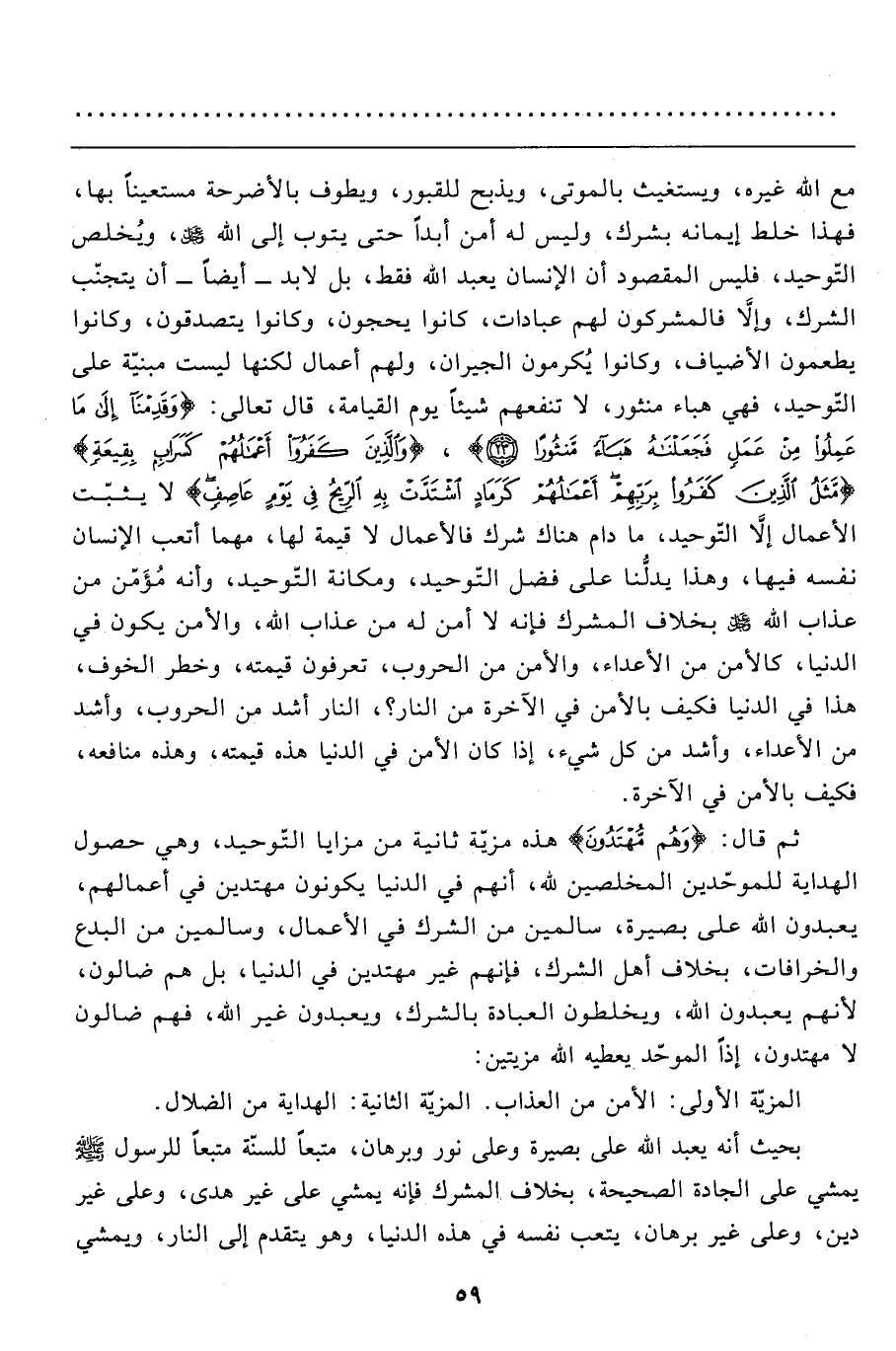 مع الله غيره، ويستغيث بالموتى، ويذبح للقبور، ويطوف بالأضرحة مستعيناً بها، فهذا خلط إيمانه بشرك، وليس له أمن أبداً حتى يتوب إلى الله عزّ وجلّ، ويُخلص التّوحيد، فليس المقصود أن الإنسان يعبد الله فقط، بل لابد- أيضاً- أن يتجنّب الشرك، وإلاَّ فالمشركون لهم عبادات، كانوا يحجون، وكانوا يتصدقون، وكانوا يطعمون الأضياف، وكانوا يُكرمون الجيران، ولهم أعمال لكنها ليست مبنيّة على التّوحيد، فهي هباء منثور، لا تنفعهم شيئاً يوم القيامة، قال تعالى: {وَقَدِمْنَا إِلَى مَا عَمِلُوا مِنْ عَمَلٍ فَجَعَلْنَاهُ هَبَاءً مَنْثُوراً (23) } ، {وَالَّذِينَ كَفَرُوا أَعْمَالُهُمْ كَسَرَابٍ بِقِيعَةٍ} {مَثَلُ الَّذِينَ كَفَرُوا بِرَبِّهِمْ أَعْمَالُهُمْ كَرَمَادٍ اشْتَدَّتْ بِهِ الرِّيحُ فِي يَوْمٍ عَاصِفٍ} لا يثبّت الأعمال إلاَّ التّوحيد، ما دام هناك شرك فالأعمال لا قيمة لها، مهما أتعب الإنسان نفسه فيها، وهذا يدلُّنا على فضل التّوحيد، ومكانة التّوحيد، وأنه مُؤَمّن من عذاب الله عزّ وجلّ بخلاف المشرك فإنه لا أمن له من عذاب الله، والأمن يكون في الدنيا، كالأمن من الأعداء، والأمن من الحروب، تعرفون قيمته، وخطر الخوف، هذا في الدنيا فكيف بالأمن في الآخرة من النار؟، النار أشد من الحروب، وأشد من الأعداء، وأشد من كل شيء، إذا كان الأمن في الدنيا هذه قيمته، وهذه منافعه، فكيف بالأمن في الآخرة.