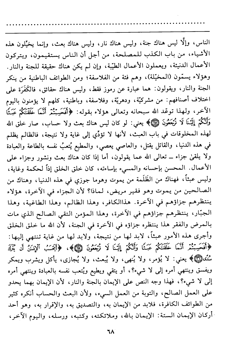 وهؤلاء يسمّون (المخيّلة) ، وهم فئة من الفلاسفة؛ ومن الطوائف الباطنية من ينكر الجنة والنار، ويقولون: هما عبارة عن رموز فقط، وليس هناك حقائق، فالكَفَرَة على اختلاف أصنافهم: من مشركيّة، ودهريّة، وفلاسفة، وباطنية، كلهم لا يؤمنون باليوم الآخر، ولهذا توعد الله سبحانه وتعالى هؤلاء بقوله: {أَفَحَسِبْتُمْ أَنَّمَا خَلَقْنَاكُمْ عَبَثاً وَأَنَّكُمْ إِلَيْنَا لا تُرْجَعُونَ (115) } يعني: لو كان ليس هناك بعث ولا حساب، صار خلق الله لهذه المخلوقات في باب العبث، لأنها لا تؤدِّي إلى غاية ولا نتيجة، فالظالم يظلم في هذه الدنيا، والقاتل يقتل، والعاصي يعصي، والمطيع يُتعبُ نفسه بالطاعة والعبادة ولا يلقى جزاء- تعالى الله عما يقولون، أما إذا كان هناك بعث ونشور وجزاء على الأعمال. المحسن بإحسانه والمسيء بإساءته، كان خلق الخلق إذاً لحكمة وغاية، وليس عبثاً، فهناك من الظَلَمة من يموت وهو ما جوزي في هذه الدنيا، وهناك من الصالحين من يموت وهو فقير مريض، لماذا؟ لأن الجزاء في الآخرة، هؤلاء ينتظرهم جزاؤهم في الآخرة. هذا الكافر، وهذا الظالم، وهذا الطاغية، وهذا الجبّار، ينتظرهم جزاؤهم في الآخرة، وهذا المؤمن التقي الصالح الذي مات بالمرض والفقر هذا ينتظره جزاؤه في الآخرة في الجنّة، لأن الله ما خلق الخلق وأجرى هذه الأمور عبثاً، لا بد لها من نتيجة، ولا بد لها من غاية تنتهي إليها: {أَفَحَسِبْتُمْ أَنَّمَا خَلَقْنَاكُمْ عَبَثاً وَأَنَّكُمْ إِلَيْنَا لا تُرْجَعُونَ (115) } ، {أَيَحْسَبُ الإنسان أَنْ يُتْرَكَ سُدىً (36) } يعني: لا يُؤمر، ولا يُنهى، ولا يُبعث، ولا يُجازى، يأكل ويشرب ويمكر ويفسق وينتهي أمره إلى لا شيء؟، أو يتقي ويطيع ويتعب نفسه بالعبادة وينتهي أمره إلى لا شيء؟، فهذا وجه النص على الإيمان بالجنة والنار، لأن الإيمان بهما يحدو على العمل الصالح، والتوبة من العمل السيئ، ولأن البعث والحساب أنكره كثير من الطوائف الكافرة، فلابد من الإيمان به، والتصديق به، والإقرار به، وهو أحد أركان الإيمان الستة: الإيمان بالله، وملائكته، وكتبه، ورسله، واليوم الآخر،