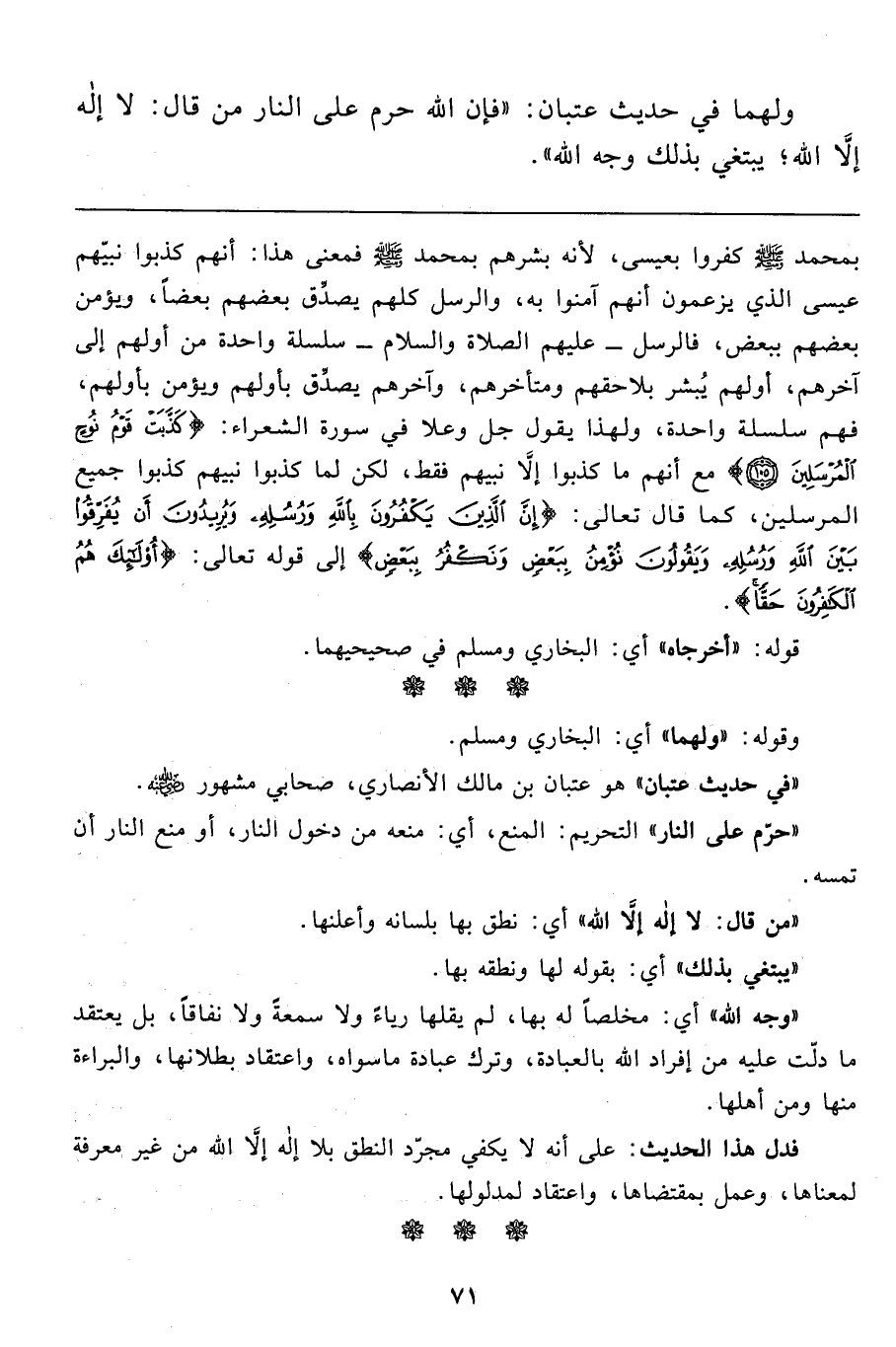 ولهما في حديث عتبان: "فإن الله حرم على النار من قال: لا إله إلاَّ الله؛ يبتغي بذلك وجه الله".