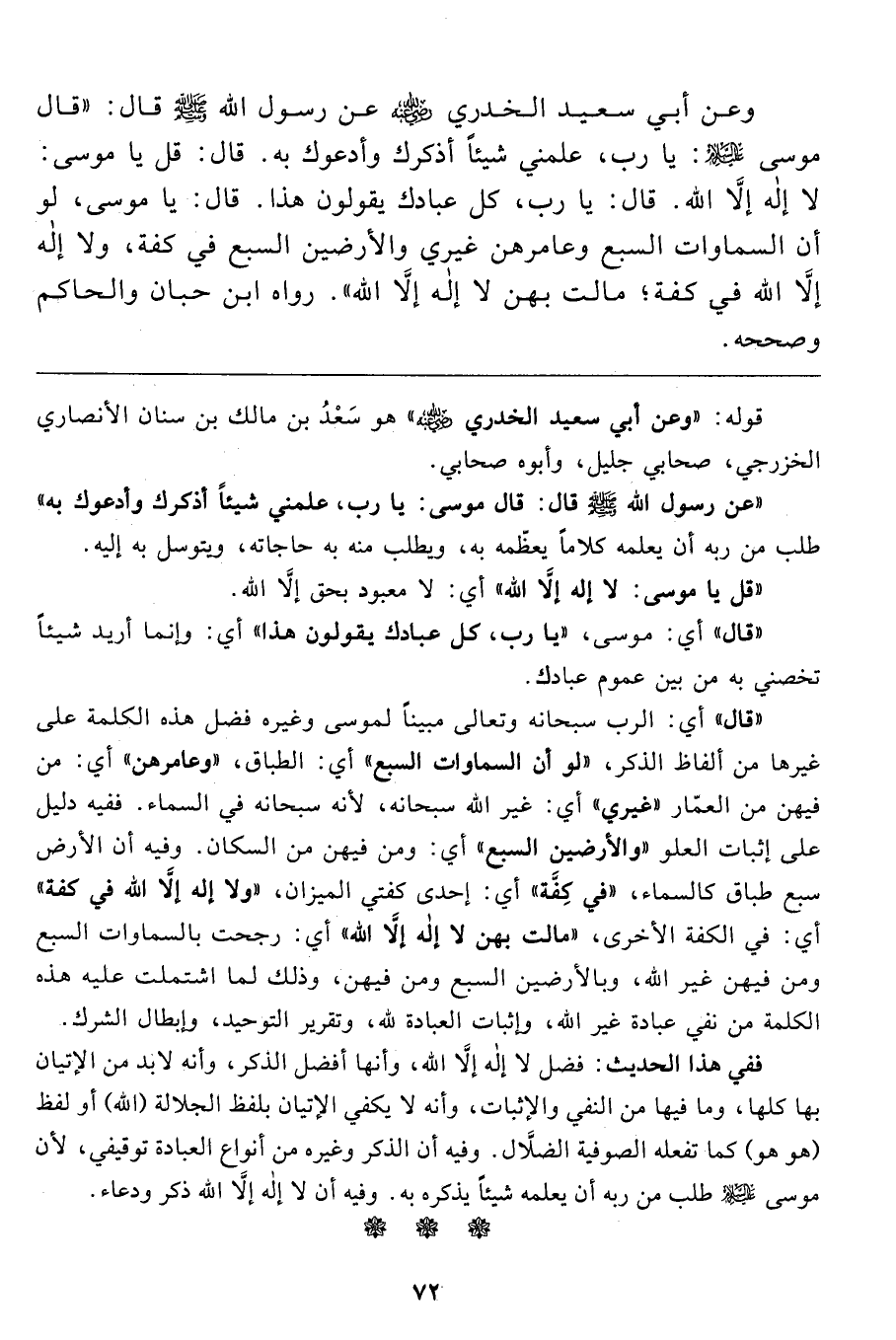 وعن أبي سعيد الخدري رضي الله عنه عن رسول الله صَلَّى اللَّهُ عَلَيْهِ وَسَلَّمَ قال: "قال موسى عليه السلام: يا رب، علمني شيئاً أذكرك وأدعوك به. قال: قل يا موسى: لا إله إلاَّ الله. قال: يا رب، كل عبادك يقولون هذا. قال: يا موسى، لو أن السماوات السبع وعامرهن غيري والأرضين السبع في كفة، ولا إله إلاَّ الله في كفة؛ مالت بهن لا إله إلاَّ الله". رواه ابن حبان والحاكم، وصححه.