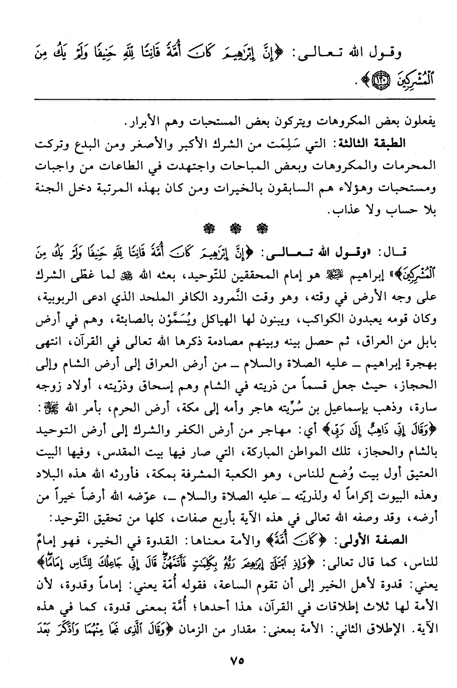 قال: "وقول الله تعالى: {إِنَّ إِبْرَاهِيمَ كَانَ أُمَّةً قَانِتاً لِلَّهِ حَنِيفاً وَلَمْ يَكُ مِنَ الْمُشْرِكِينَ} إبراهيم عليه السلام هو إمام المحققين للتوحيد، بعثه الله عزّ وجلّ لما غطّى الشرك على وجه الأرض في وقته، وهو وقت النَّمرود الكافر الملحد الذي ادعى الربوبية، وكان قومه يعبدون الكواكب، ويبنون لها الهياكل ويُسَمَّوْن بالصابئة، وهم في أرض بابل من العراق، ثم حصل بينه وبينهم مصادمة ذكرها الله تعالى في القرآن، انتهى بهجرة إبراهيم- عليه الصلاة والسلام- من أرض العراق إلى أرض الشام وإلى الحجاز، حيث جعل قسماً من ذريته في الشام وهم إسحاق وذرّيته، أولاد زوجه ي سارة، وذهب بإسماعيل بن سُرِّيته هاجر وأمه إلى مكة، أرض الحرم، بأمر الله سبحانه وتعالى: {وَقَالَ إِنِّي ذَاهِبٌ إِلَى رَبِّي سَيَهْدِينِ} أي: مهاجر من أرض الكفر والشرك إلى أرض التّوحيد بالشام والحجاز، تلك المواطن المباركة، التي صار فيها بيت المقدس، وفيها البيت العتيق أول بيت وُضع للناس، وهو الكعبة المشرفة بمكة، فأورثه الله هذه البلاد وهذه البيوت إكراماً له ولذريّته- عليه الصلاة والسلام-، عوّضه الله أرضاً خيراً من أرضه، وقد وصفه الله تعالى في هذه الآية بأربع صفات، كلها من تحقيق التّوحيد: