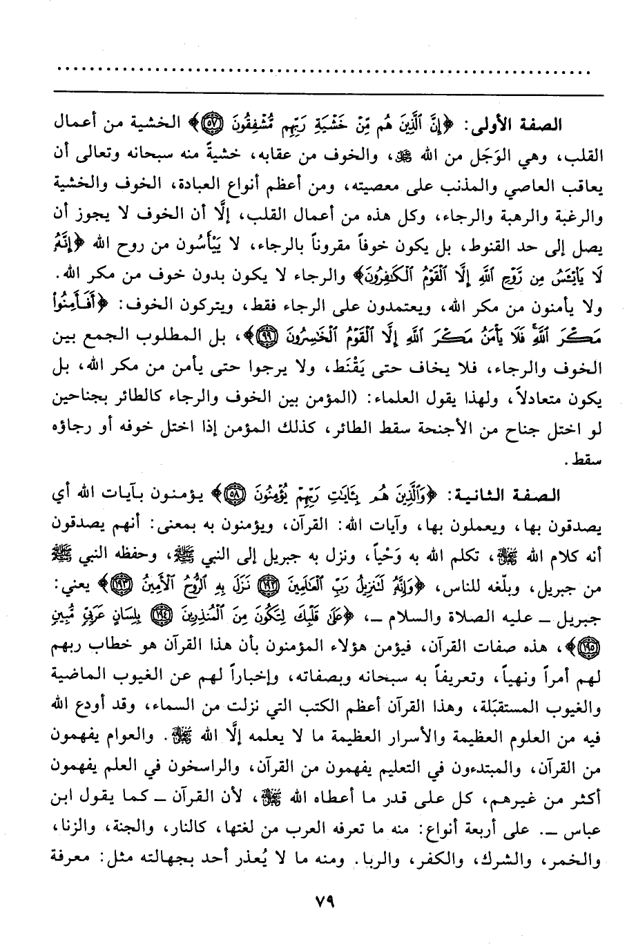 الصفة الثانية: {وَالَّذِينَ هُمْ بِآياتِ رَبِّهِمْ يُؤْمِنُونَ (58) } ، يؤمنون بآيات الله أي يصدقون بها، ويعملون بها، وآيات الله: القرآن، ويؤمنون به بمعنى: أنهم يصدقون أنه كلام الله سبحانه وتعالى، تكلم الله به وَحْياً، ونزل به جبريل إلى النبي صَلَّى اللَّهُ عَلَيْهِ وَسَلَّمَ، وحفظه النبي صَلَّى اللَّهُ عَلَيْهِ وَسَلَّمَ من جبريل، وبلّغه للناس، {وَإِنَّهُ لَتَنْزِيلُ رَبِّ الْعَالَمِينَ (192) نَزَلَ بِهِ الرُّوحُ الأَمِينُ (193) } يعني: جبريل- عليه الصلاة والسلام-، {عَلَى قَلْبِكَ لِتَكُونَ مِنَ الْمُنْذِرِينَ (194) بِلِسَانٍ عَرَبِيٍّ مُبِينٍ (195) } ، هذه صفات القرآن، فيؤمن هؤلاء المؤمنون بأن هذا القرآن هو خطاب ربهم لهم أمراً ونهياً، وتعريفاً به سبحانه وبصفاته، وإخباراً لهم عن الغيوث الماضية والغيوب المستقبَلة، وهذا القرآن أعظم الكتب التي نزلت من السماء، وقد أودع الله فيه من العلوم العظيمة والأسرار العظيمة ما لا يعلمه إلاَّ الله سبحانه وتعالى. والعوام يفهمون من القرآن، والمبتدءون في التعليم يفهمون من القرآن، والراسخون في العلم يفهمون أكثر من غيرهم، كل على قدر ما أعطاه الله سبحانه وتعالى، لأن القرآن- كما يقول ابن عباس-. على أربعة أنواع: منه ما تعرفه العرب من لغتها، كالنار، والجنة، والزنا، والخمر، والشرك، والكفر، والربا. ومنه ما لا يُعذر أحد بجهل الله مثل: معرفة