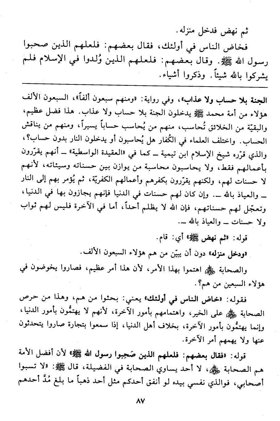 الجنة بلا حساب ولا عذاب"، وفي رواية: "ومنهم سبعون ألفاً"، السبعون الألف هؤلاء من أمّة محمد صَلَّى اللَّهُ عَلَيْهِ وَسَلَّمَ يدخلون الجنة بلا حساب ولا عذاب. هذا فضل عظيم، والبقيّة من الخلائق تُحاسب، منهم من يُحاسب حساباً يسيراً، ومنهم من يناقش الحساب. واختلف العلماء في الكُفار هل يُحاسبون أو يدخلون النار بدون حساب؟، والذي قرّره شيخ الإسلام ابن تيمية- كما في "العقيدة الواسطية"- أنهم يقرّرون بأعمالهم فقط، ولا يحاسبون محاسبة من يوازن بين حسناته وسيئاته، لأنهم لا حسنات لهم، ولكنهم يقرّرون بكفرهم وأعمالهم الكفريّة، ثم يُؤمر بهم إلى النار - والعياذ بالله-. وان كان لهم حسنات في الدنيا فإنهم يجازون بها في الدنيا، وتعجّل لهم حسناتهم، فإن الله لا يظلم أحداً، أما في الآخرة فليس لهم ثواب ولا حسنات- والعياذ بالله-.