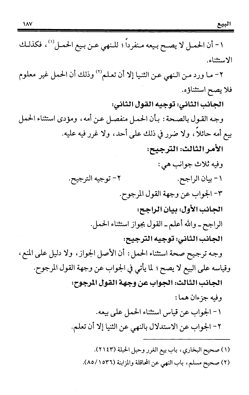 2 - ما ورد من النهي عن الثنيا إلا أن تعلم (¬2) وذلك أن الحمل غير معلوم فلا يصح استثناؤه.