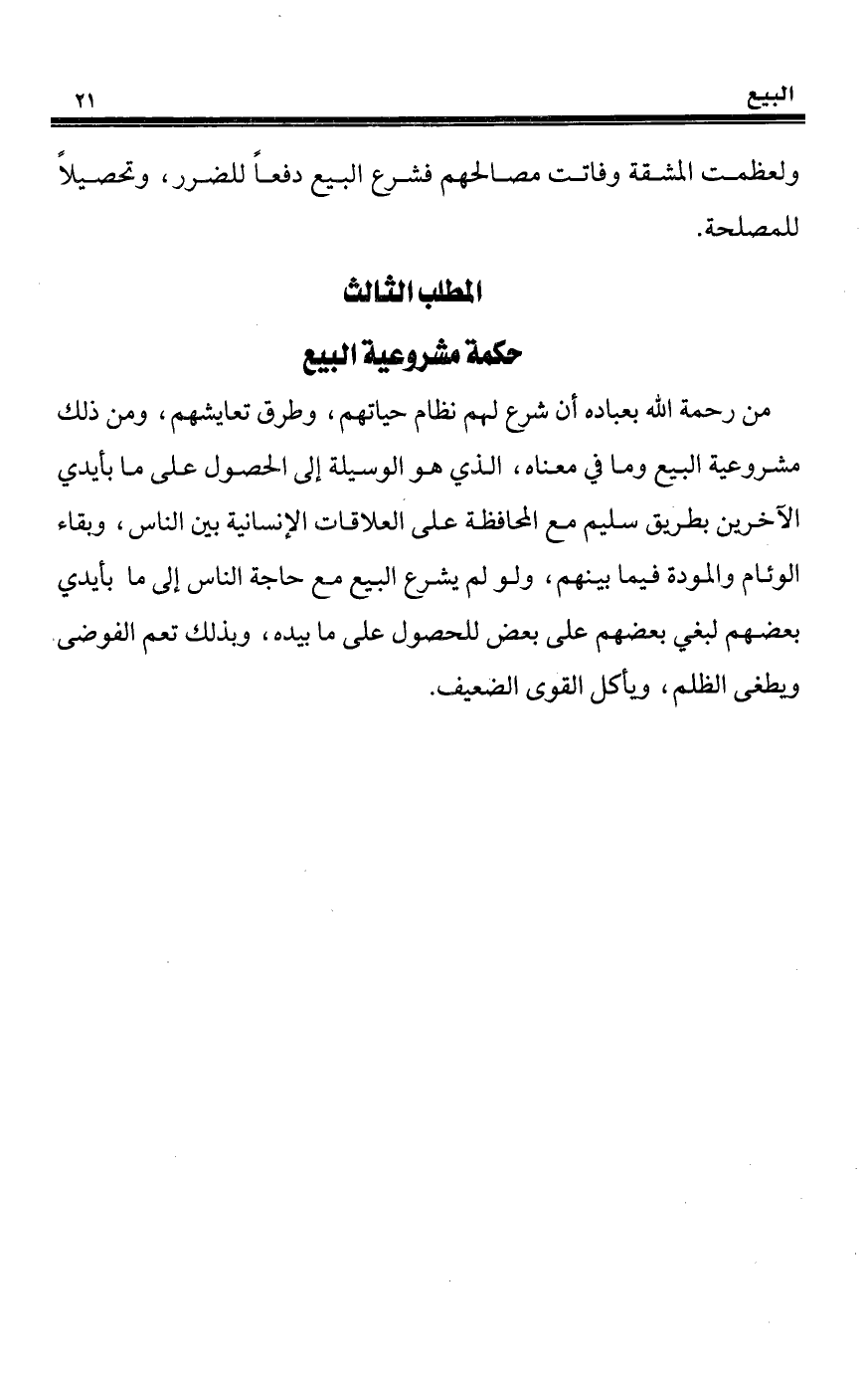 من رحمة الله بعباده أن شرع لهم نظام حياتهم، وطوق تعايشهم، ومن ذلك مشروعية البيع وما في معناه، الذي هو الوسيلة إلى الحصول على ما بأيدي الآخرين بطريق سليم مع المحافظة على العلاقات الإنسانية بين الناس، وبقاء الوئام والمودة فيما بينهم، ولو لم يشرع البيع مع حاجة الناس إلى ما بأيدي بعضهم لبغي بعضهم على بعض للحصول على ما بيده، وبذلك تعم الفوضى ويطغى الظلم، ويأكل القوى الضعيف.