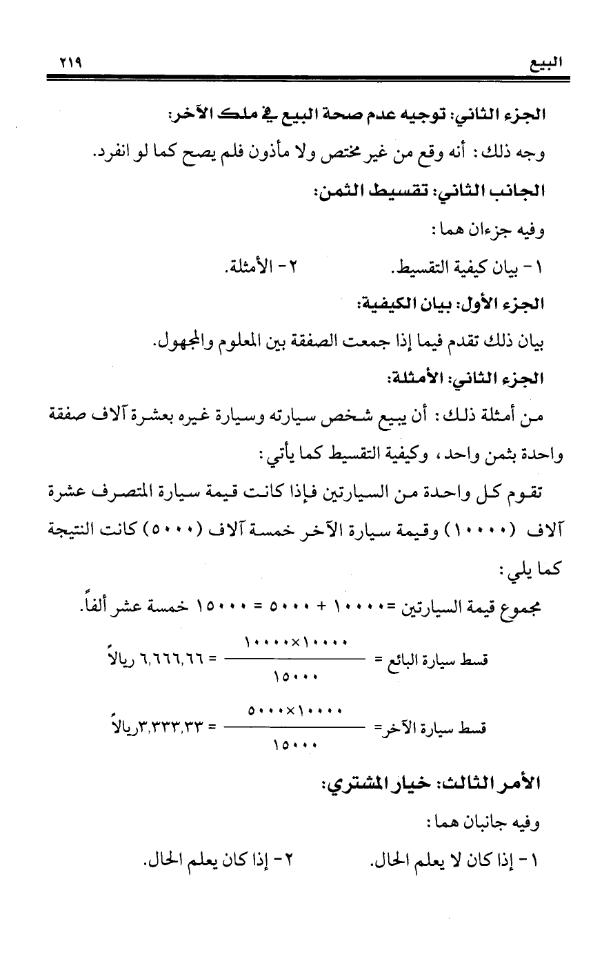 من أمثلة ذلك: أن يبيع شخص سيارته وسيارة غيره بعشرة آلاف صفقة واحدة بثمن واحد، وكيفية التقسيط كما يأتي: