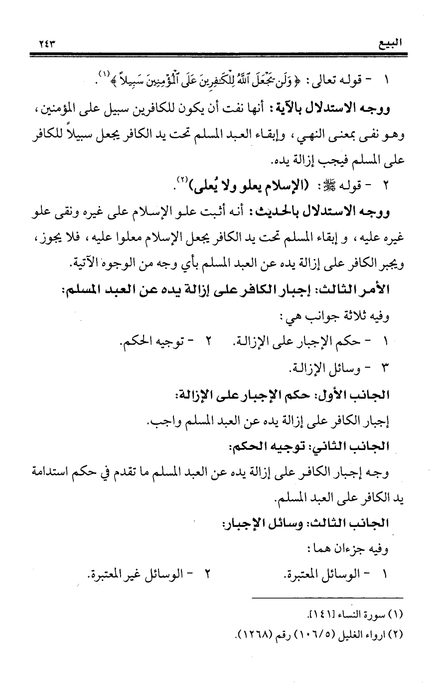 ووجه الاستدلال بالآية: أنها نفت أن يكون للكافرين سبيل على المؤمنين، وهو نفى بمعنى النهي، وإبقاء العبد المسلم تحت يد الكافر يجعل سبيلًا للكافر على المسلم فيجب إزالة يده.