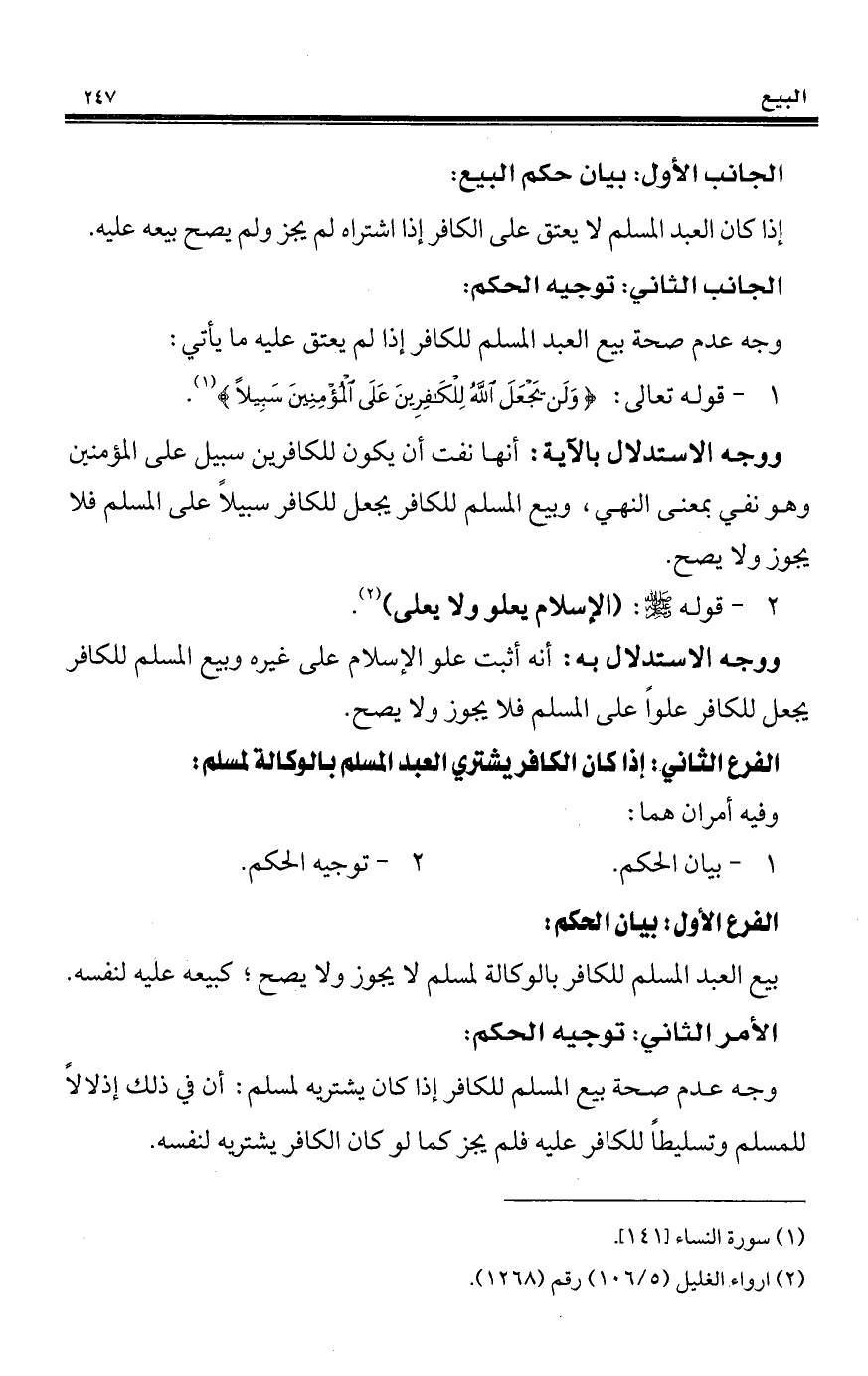 ووجه الاستدلال بالآية: أنها نفت أن يكون للكافرين سبيل على المؤمنين وهو نفي بمعنى النهي، وبيع المسلم للكافر يجعل للكافر سبيلًا على المسلم فلا يجوز ولا يصح.