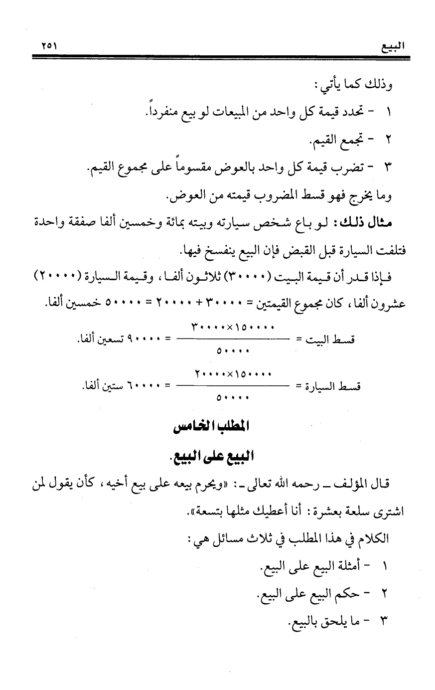 فإذا قدر أن قيمة البيت (30000) ثلاثون ألفا، وقيمة السيارة (20000) عشرون ألفا، كان مجموع القيمتين = 30000 - 20000 = 50000 خمسين ألفا.