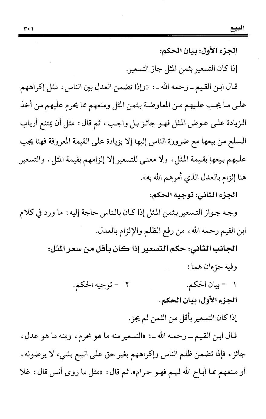 قال ابن القيم - رحمه الله -: "وإذا تضمن العدل بين الناس، مثل إكراههم على ما يجب عليهم من المعاوضة بثمن المثل ومنعهم مما يحرم عليهم من أخذ الزيادة على عوض المثل فهو جائز بل واجب، ثم قال: مثل أن يمتنع أرباب السلع من بيعها مع ضرورة الناس إليها إلا بزيادة على القيمة المعروفة فهنا يجب عليهم بيعها بقيمة المثل، ولا معنى للتسعير إلا إلزامهم بقيمة المثل، والتسعير هنا إلزام بالعدل الذي أمرهم الله به".