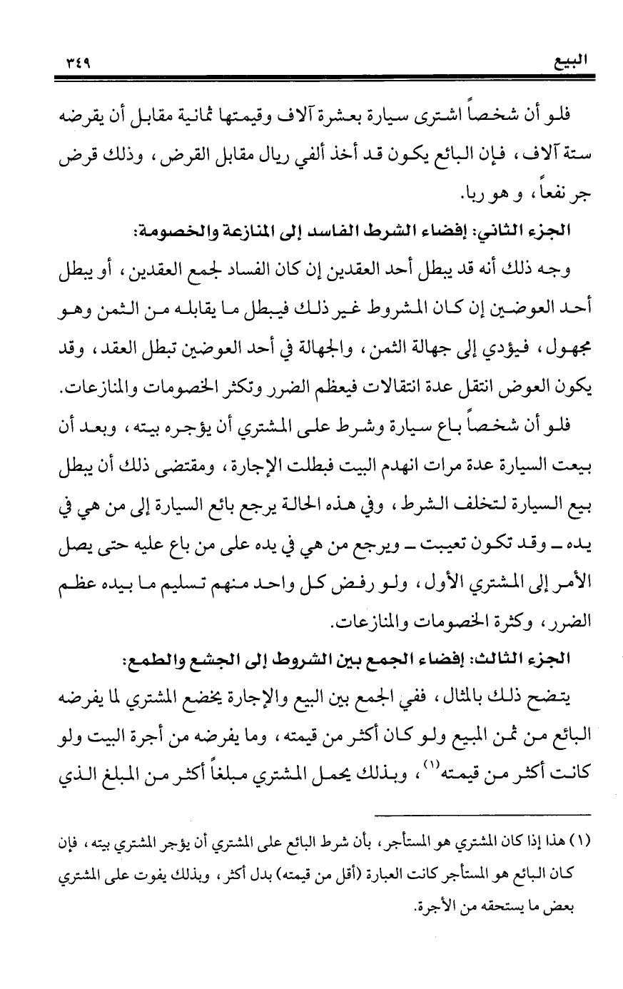 (¬1) هذا إذا كان المشتري هو المستأجر، بأن شرط البائع على المشتري أن يؤجر المشتري بيته، فإن كان البائع هو المستأجر كانت العبارة (أقل من قيمته) بدل أكثر، وبذلك يفوت على المشتري بعض ما يستحقه من الأجرة.