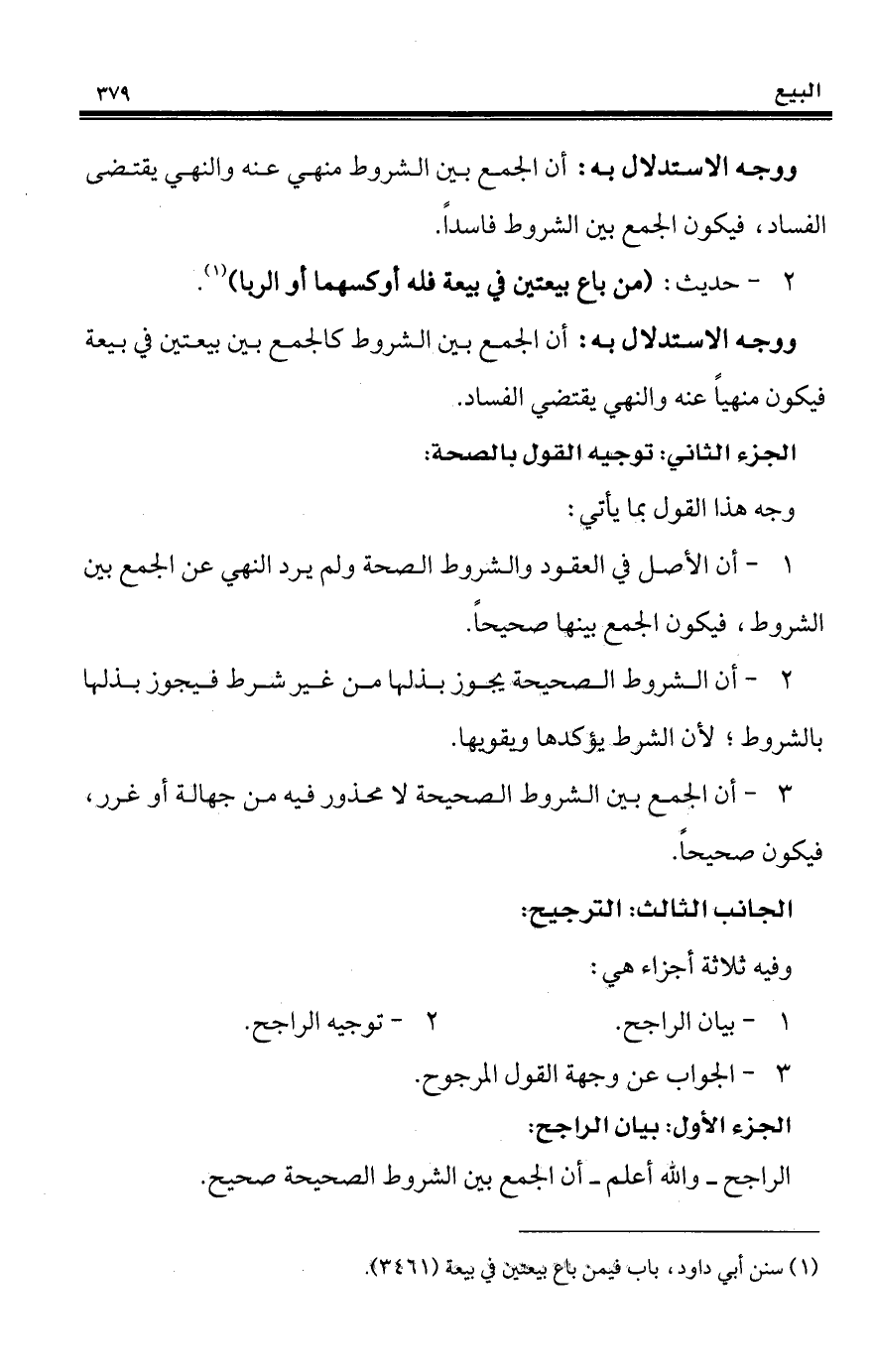 ووجه الاستدلال به: أن الجمع بين الشروط كالجمع بين بيعتين في بيعة فيكون منهيًا عنه والنهي يقتضي الفساد.