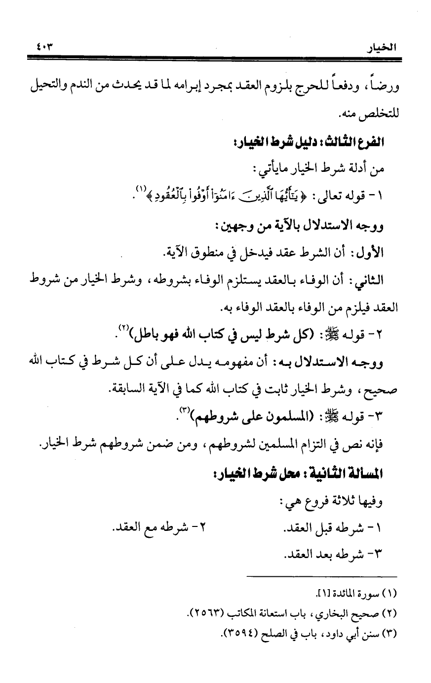 الثاني: أن الوفاء بالعقد يستلزم الوفاء بشروطه، وشرط الخيار من شروط العقد فيلزم من الوفاء بالعقد الوفاء به.