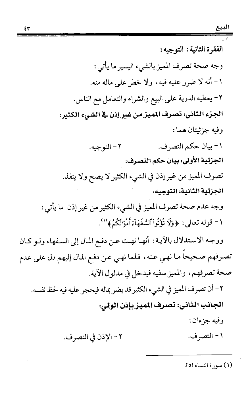 ووجه الاستدلال بالآية: أنها نهت عن دفع المال إلى السفهاء ولو كان تصرفهم صحيحًا ما نهي عنه، فلما نهي عن دفع المال إليهم دل على عدم صحة تصرفهم، والمميز سفيه فيدخل في مدلول الآية.