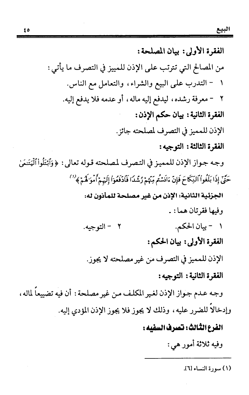 وجه جواز الإذن للمميز في التصرف لمصلحته قوله تعالى: {وَابْتَلُوا الْيَتَامَى حَتَّى إِذَا بَلَغُوا النِّكَاحَ فَإِنْ آنَسْتُمْ مِنْهُمْ رُشْدًا فَادْفَعُوا إِلَيْهِمْ أَمْوَالَهُمْ} (¬1).