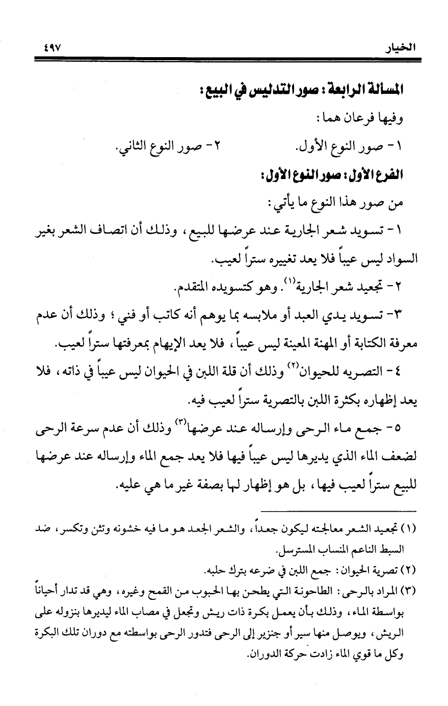 5 - جمع ماء الرحى وإرساله عند عرضها (¬3) وذلك أن عدم سرعة الرحى لضعف الماء الذي يديرها ليس عيبًا فيها فلا يعد جمع الماء وإرساله عند عرضها للبيع سترًا لعيب فيها، بل هو إظهار لها بصفة غير ما هي عليه.