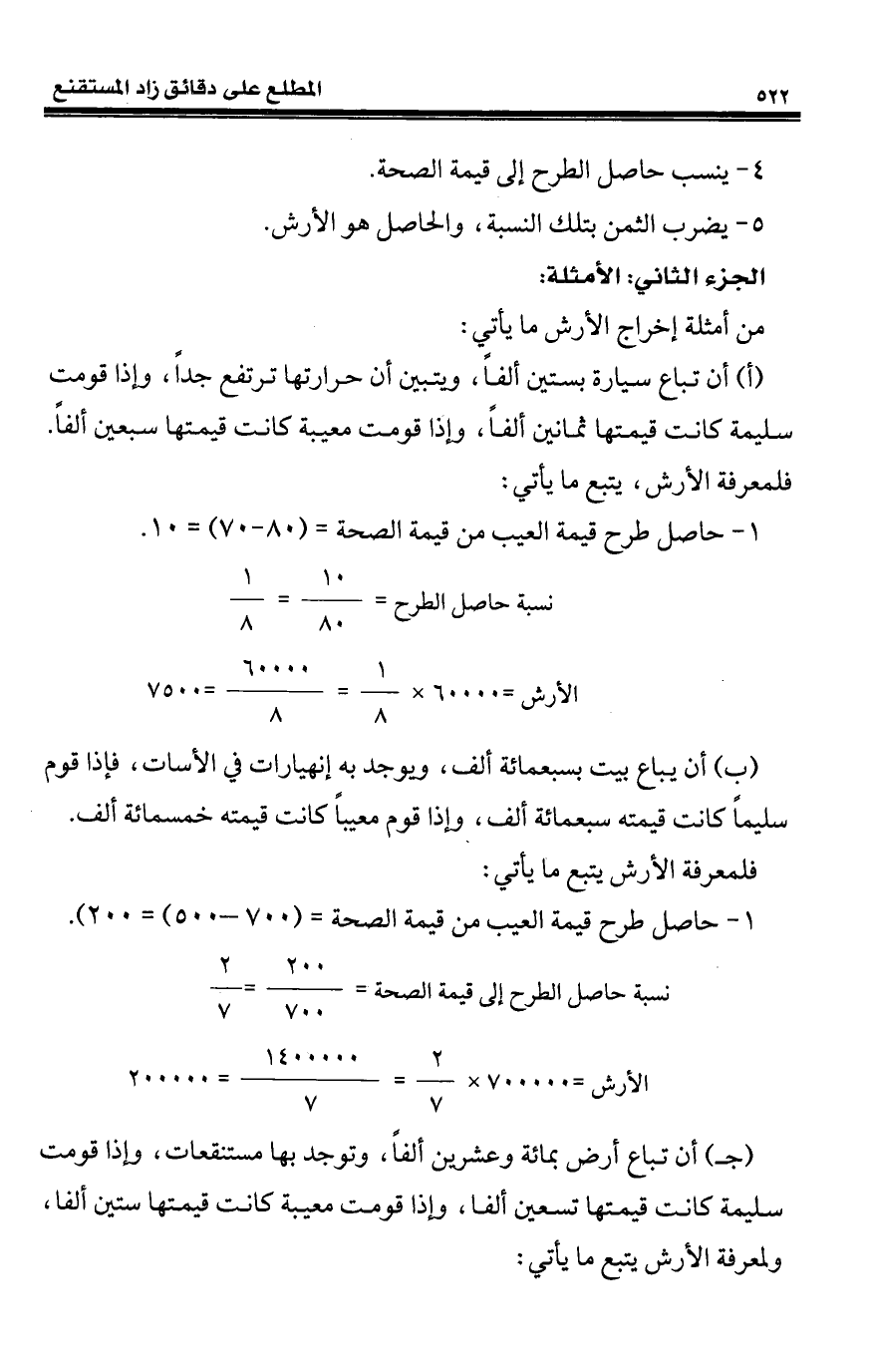(جـ) أن تباع أرض بمائة وعشرين ألفًا، وتوجد بها مستنقعات، وإذا قومت سليمة كانت قيمتها تسعين ألفا، وإذا قومت معيبة كانت قيمتها ستين ألفا، ولمعرفة الأرش يتبع ما يأتي: