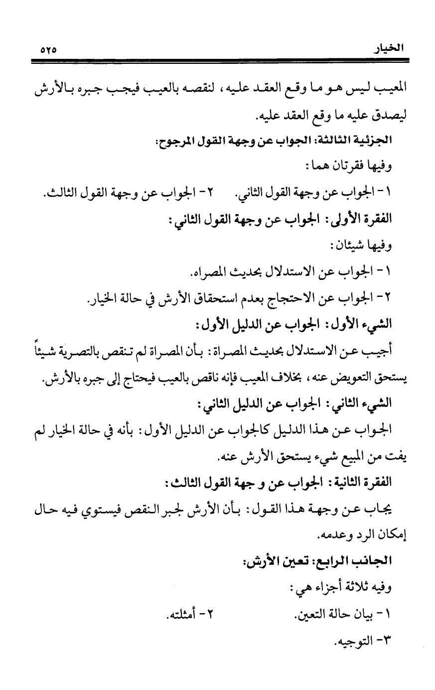 أجيب عن الاستدلال بحديث المصراة: بأن المصراه لم تنقص بالتصرية شيئًا يستحق التعويض عنه، بخلاف المعيب فإنه ناقص بالعيب فيحتاج إلى جبره بالأرش.