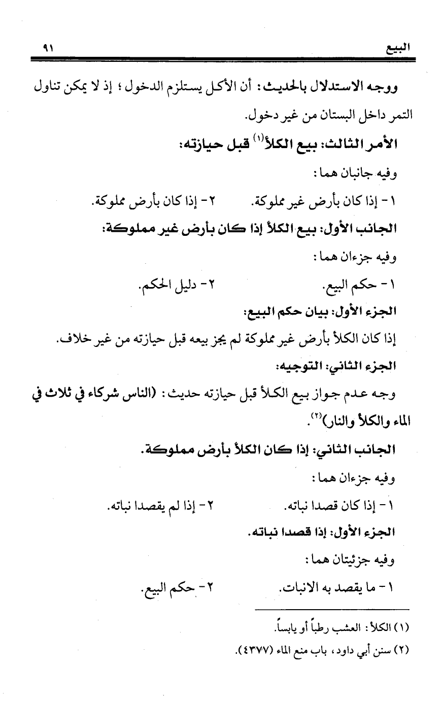 وجه عدم جواز بيع الكلأ قبل حيازته حديث: (الناس شركاء في ثلاث في الماء والكلأ والنار) (¬2).